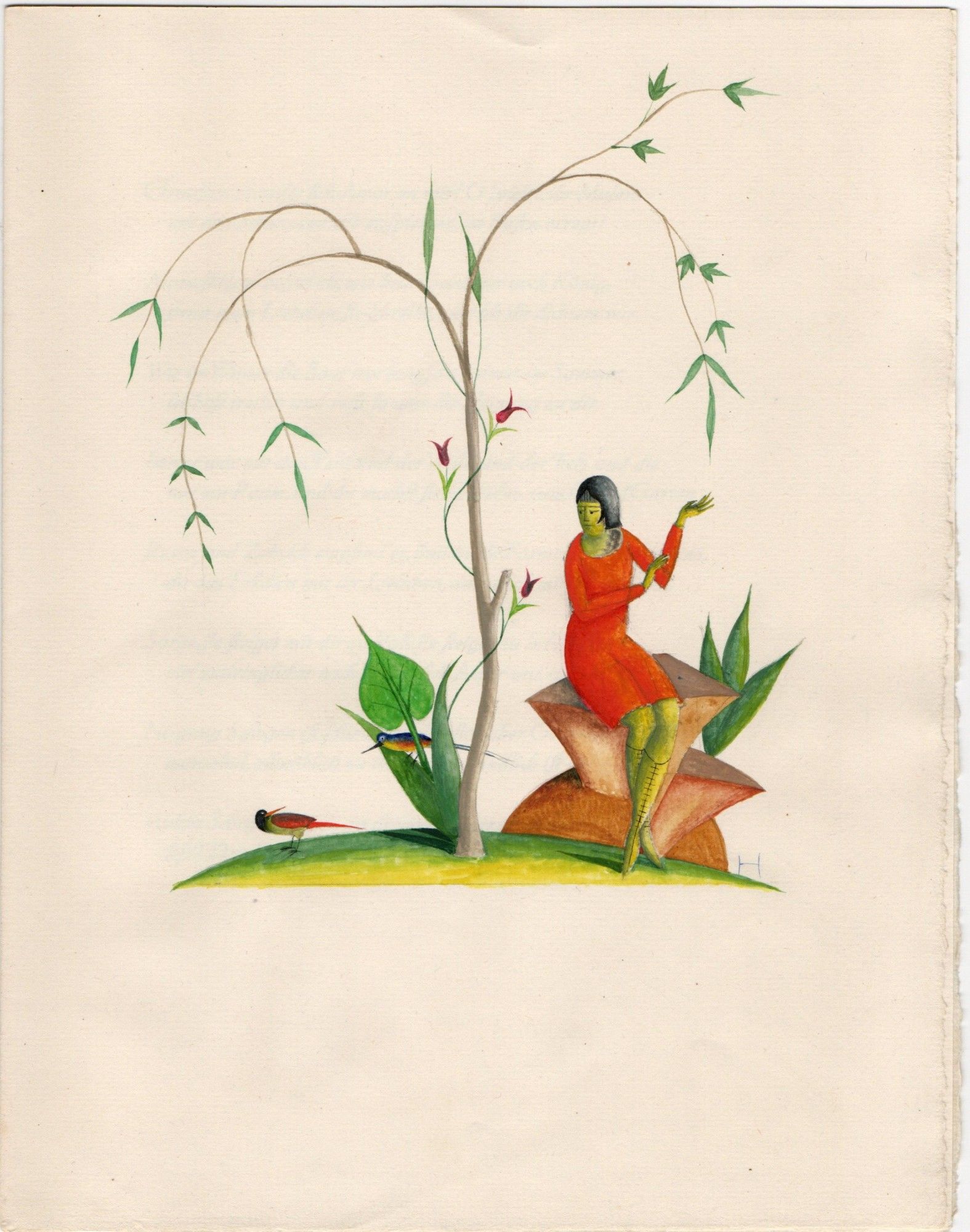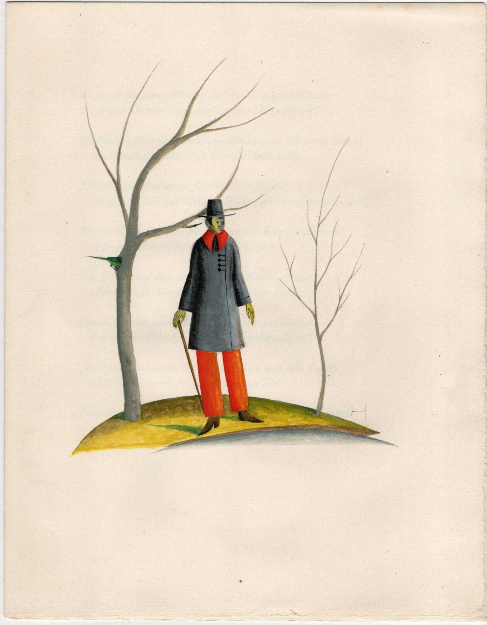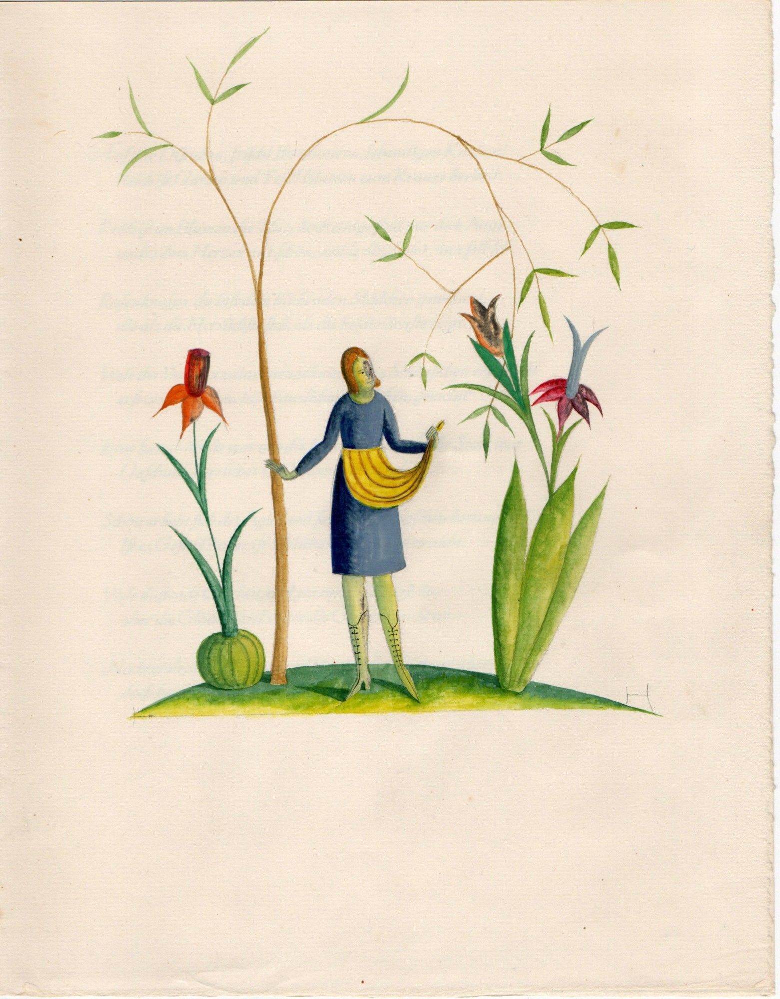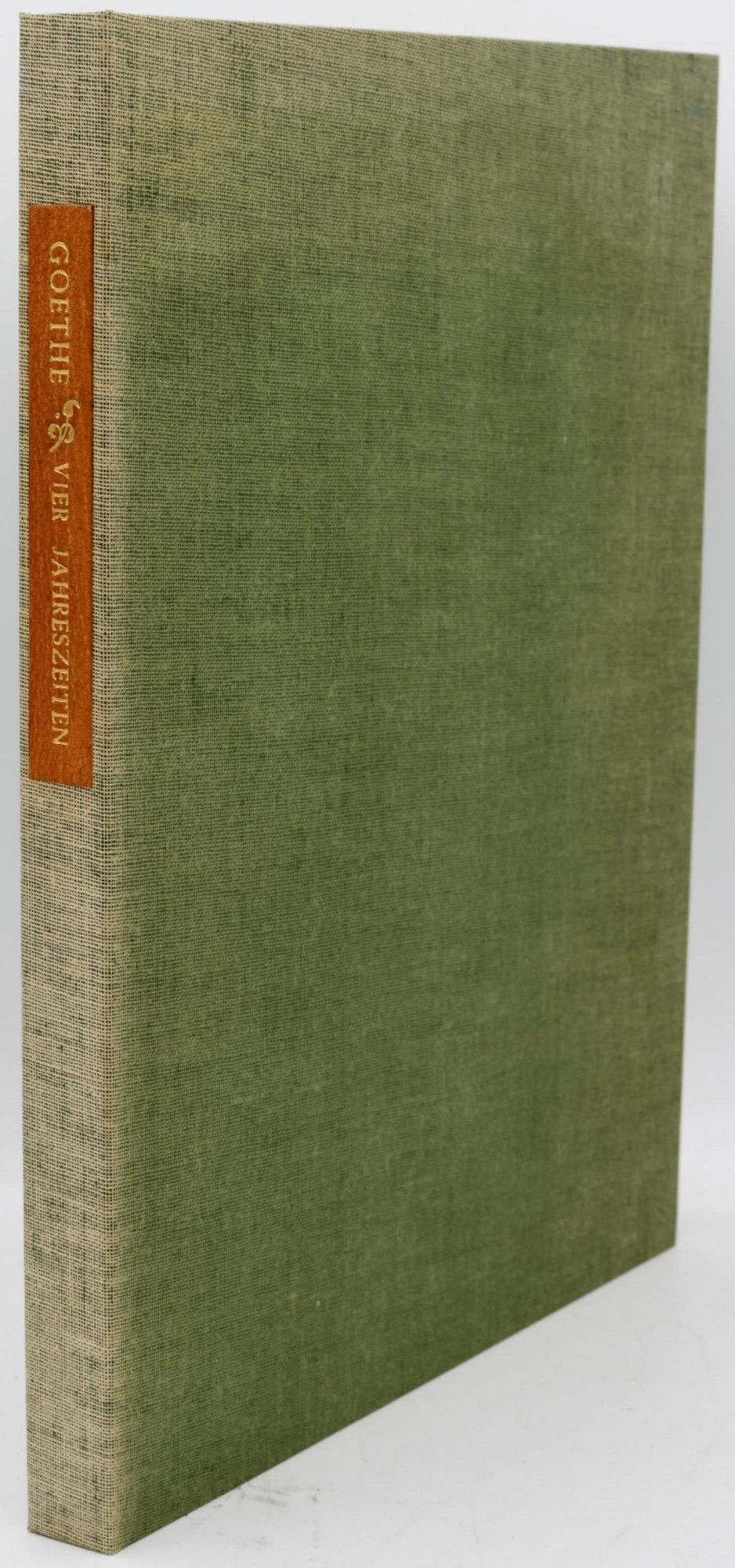Offenbach am Main: Ernst Engel, 1922. Soft Cover. Very Good binding. Large 8vo, consisting of five folded leaves, housed in a bespoke drop back box; according to Klingspor, one of four copies, each with four different original watercolors by Heinrich Holz, which were included print edition.~~Of the artist Heinrich Holz, Heinz H. Schmiedt writes in monograph Heinrich Holz: ein Maler und Illustator aus Offenbach am Main, 1890-1927 published in Darmstadt in 1966: "His people are dream creatures. They cast their gaze below themselves, their posture is wistful, and they place their foot pointedly and weightlessly on the ground... jewelry and headgear occasionally come close to the bizarre."~~The four watercolors are lovely, and are protected by tissue guards. The box is in green cloth and has a bit of sunning; it has a morocco label to the spine. Very Good binding.