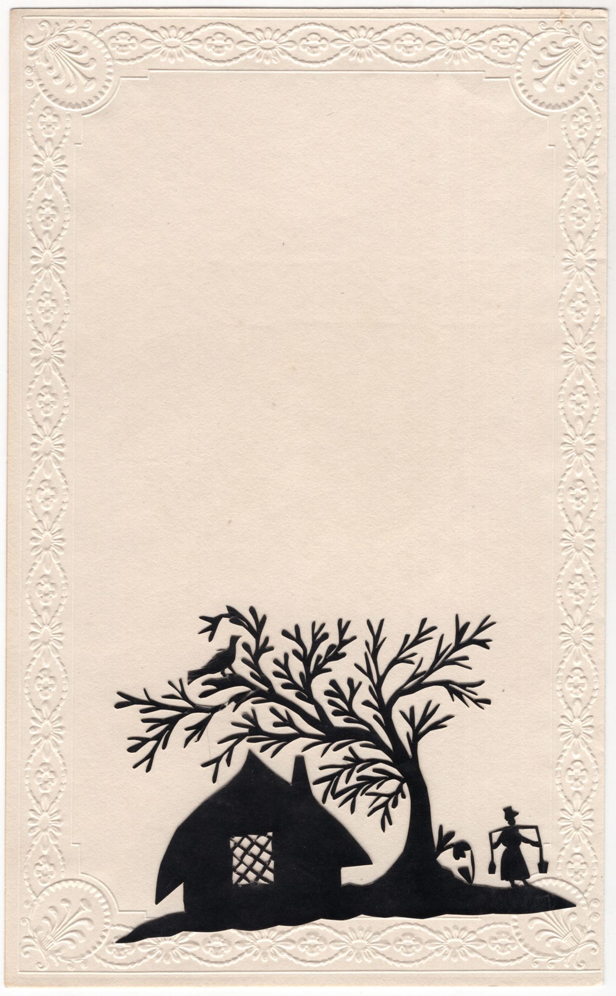 19th century. Very good. A little dust soiling to embossed papers.. Three (3) intricate and fine example of handcut cutwork silhouette scenes, each carefully cut from a single piece of coated black paper and loosely housed with contemporary embossed paper bifolia. Each depict bucolic country scenes, and work well as a series. The scenes include: a small cottage with tree, and woman hauling gallons of water over her shoulders; two women by a tree stump, with a man kneeling over a camp fire; and a woman smoking a pipe under a large tree, as her shepherd husband and sheepdog are herding a flock of sheep. The largest measures approx. 3" by 5.25", and the smallest measures approx. 2.25" by 3.5". The embossed paper bifolia each measures approx. 7.25" by 7.25" The artist's skill is evident in the tiny details, such as a small bird perched on a branch or a small pipe smoked by one of the figures.