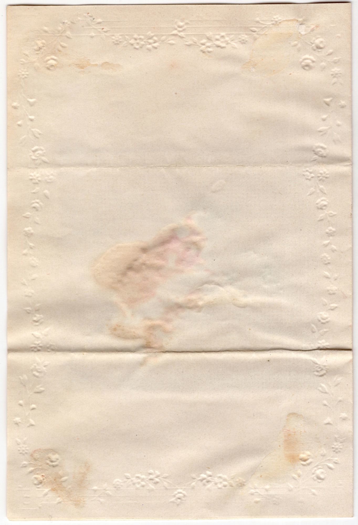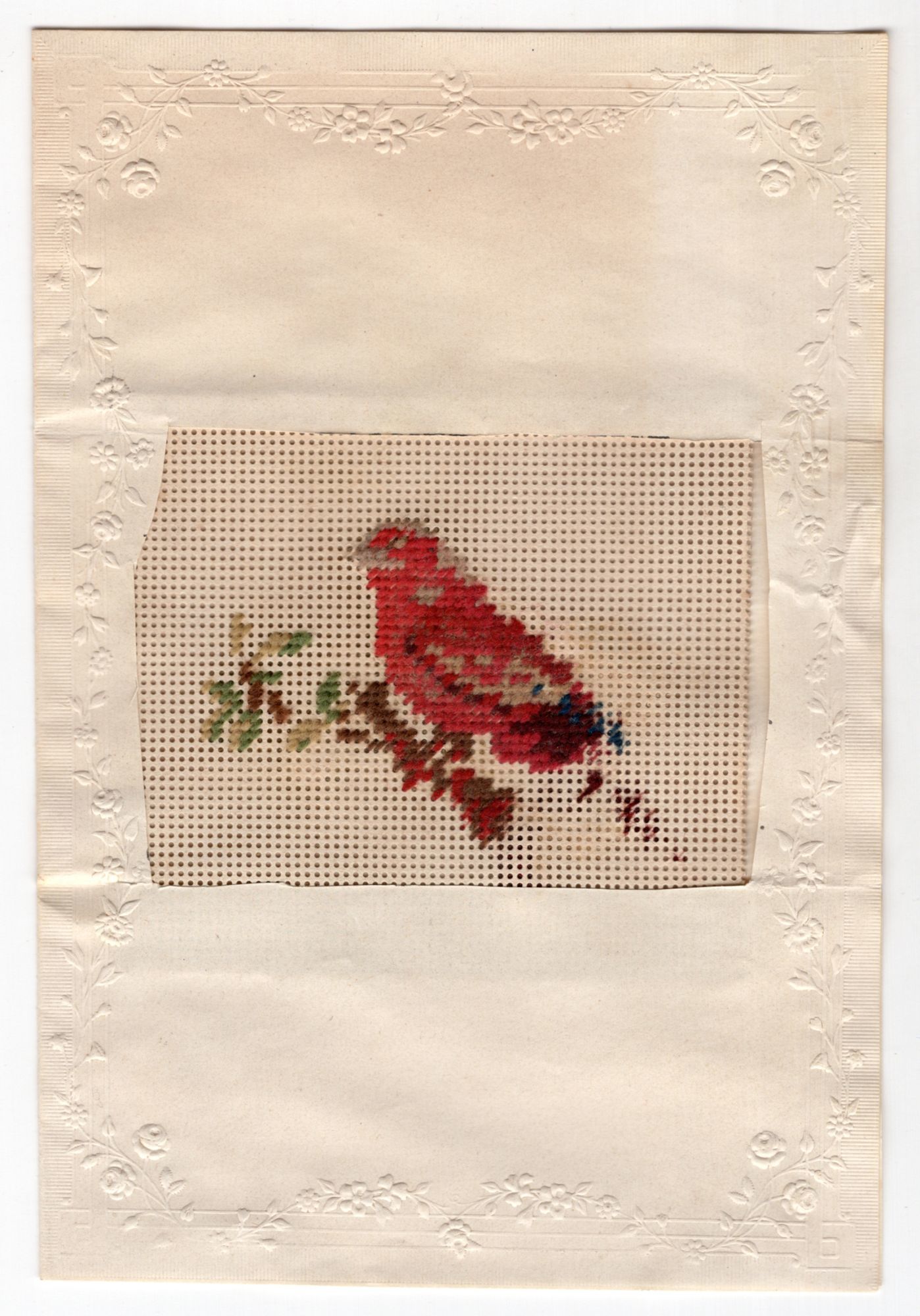 United States, 1880. Very good. A little toning, dust soiling.. Miniature needlepoint on punch paper depicting a bright red bird (perhaps a cardinal?) perched on a green branch. Mounted inside a wove paper bifolium with embossed floral border. The needlepoint is visible through a hand-cut window in the first leaf. Measures approx. 5.5" by 3.75