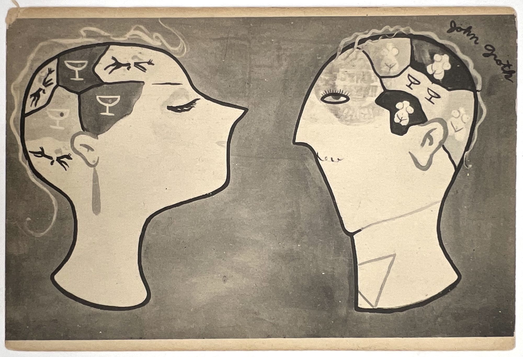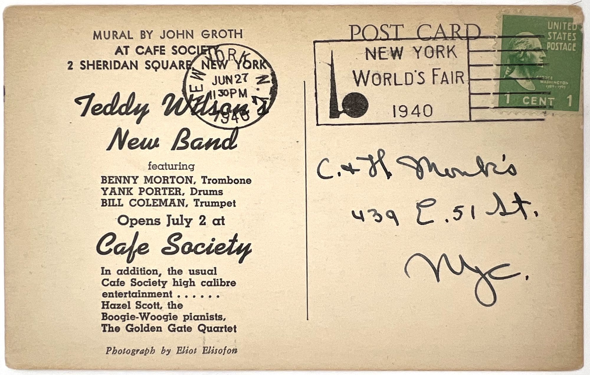New York, New York: Cafe Society, 1940. Very good. Toned, light dust soiling, corners lightly bumped.. A 1940 post card reproducing a mural by the illustrator John Groth at Cafe Society, Sheriden Square in New York, and promoting the premiere of Teddy Wilson's New Band on July 2nd. Stamped and postmarked, hand-addressed in ink manuscript. Postmark promotes the 1939-1940 World's Fair in New York. Mural depicts a cross section of a man and a woman's brain, with horse racing and drinking on the woman's mind, and women and drinking on the man's mind. Measures approx. 3.5" by 5.5