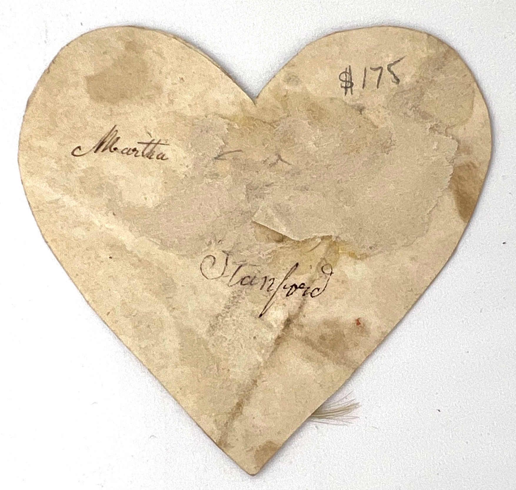 19th century. Very good. A little staining, surface wear to verso.. A handmade token of affection made from decorated paper, including bright gold embossed paper, cut into the shape of a heart. Includes a rare example of blonde hair work. The verso reads in contemporary ink, "Mattie ... Stanford" Measures approx. 2.5" by 2.5