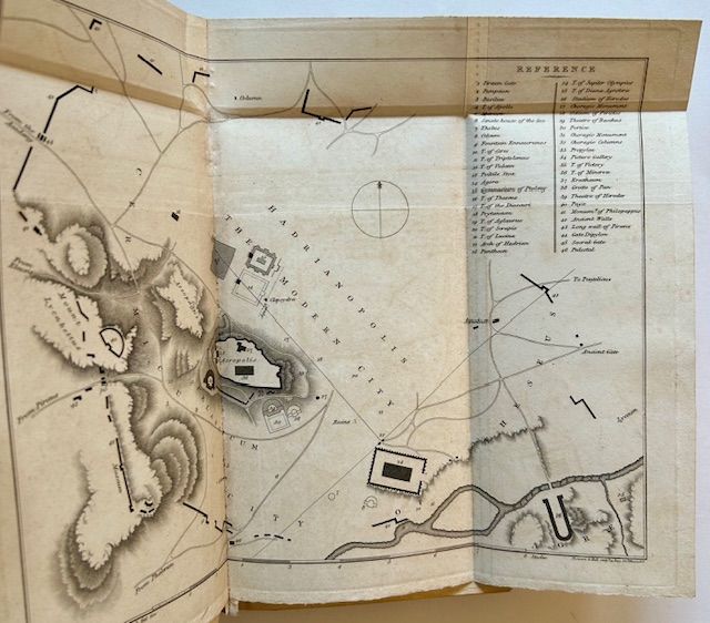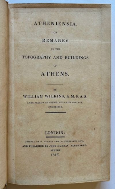 London: John Murray, 1816. Full calf. Very Good +. A wonderful Association copy: INSCRIBED BY THE AUTHOR, WILLIAM WILKINS, TO THE EARL OF OXFORD on a blank preliminary. A solid, tight copy to boot of the 1816 1st edition. Bright and VG+ in the publisher's original --or certainly contemporary-to-the-period-- full, light-brown calf, with a custom, re-backed spine (with 5 raised bands, dark leather title-label, decorative blindstamping within the compartments, gilt date-of-publication {1816} at the foot of the spine). Octavo, fold-out frontispiece map ("The Plan of Athens"), additional double-page illustration ("View of the Erectheum") facing pg. 193. A bit of mild spotting to the front pastedown and facing endsheet, a touch of mild staining at the foot of the blank preliminary where the inscription appears. Impressive and uncommon as such.