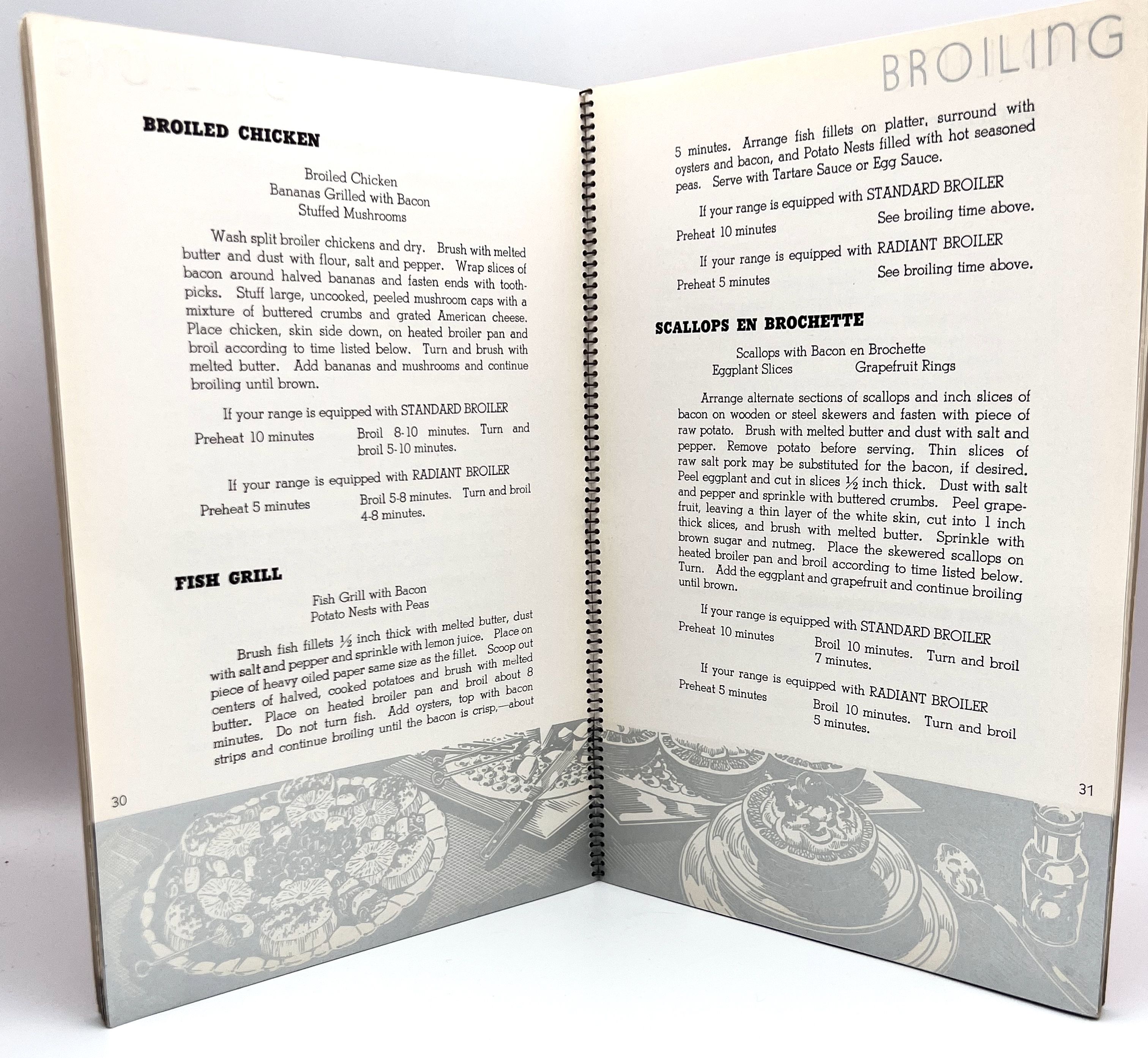 Philadelphia: Roberts & Mander Stove Company, 1936. Spiral bound wraps. Red illustrated cardboard covers, spiral metal binding. Very good. 100 pages. 23 x 15.5 cm. Elegant cook book supplied by the Roberts & Mander Stove Company. R & M Stove Co. operated a foundry and manufacturing plant (now on the National Register of Historic Places) out of Hatboro, Pennsylvania until 1950. Silver border throughout with illustrations of contemporary cuisine inset in silver. Over 200 recipes. Covers rubbed at edges and rear, interior crisp and clean.