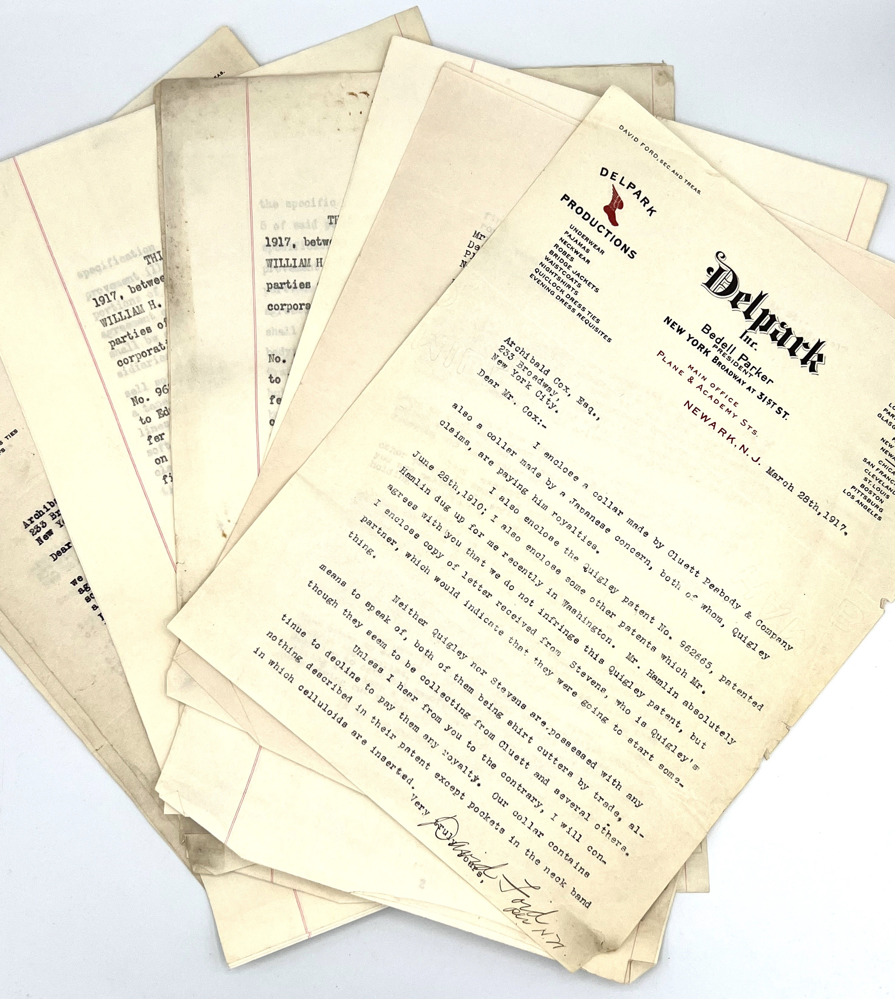 Newark, NJ, 1917-1919. 13 pages. 4 pages from Delpark Inc., a NY-based clothing company seeking a patent to manufacture a new shirt collar. Letters show clothing company owner trying to contact a solicitor to investigate the patents of its creator. Delpark seeks, in these documents, to purchase the collar's patent from the inventor, Edward J. Quigley, and his partner, William H. Stevens. 7 pages delineate the agreement between the two parties, permitting Delpark to make and sell the collar. 2 pages are a letter from Stevens, previous to the agreement, warning Delpark of infringing on the royalties of Quigley's invention. An article in The Haberdasher, January 1921, page 67, Turning a Byway Into a Buy Way - reports of the shop Edward J. Quigley & Co. is located at Astor Court, a private thoroughfare beside the Waldorf-Astoria, Mr. Quigley and his vice-president of the firm, William H. Stevens, fit custom-made shirts.