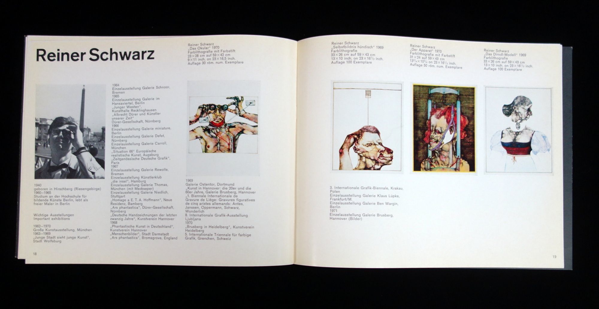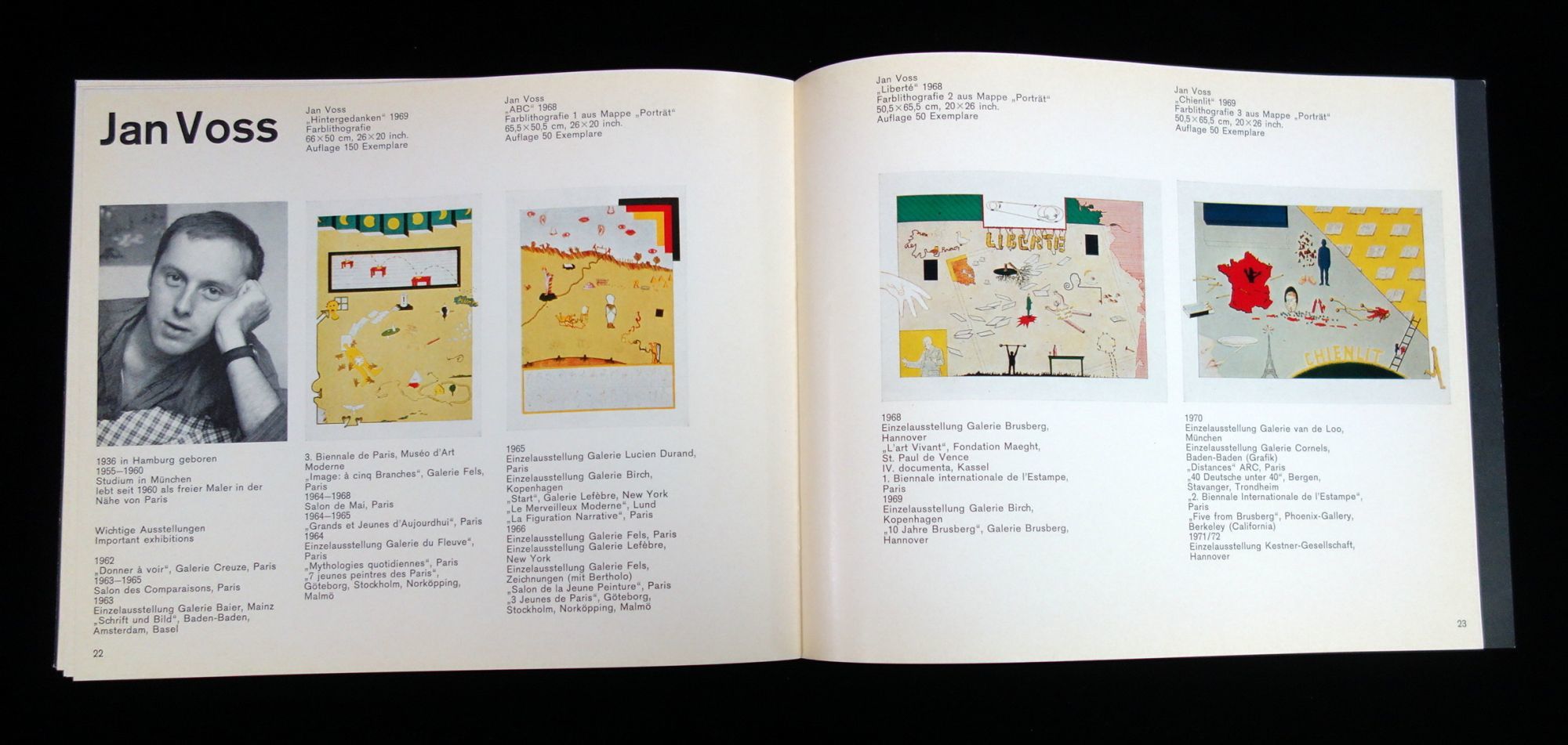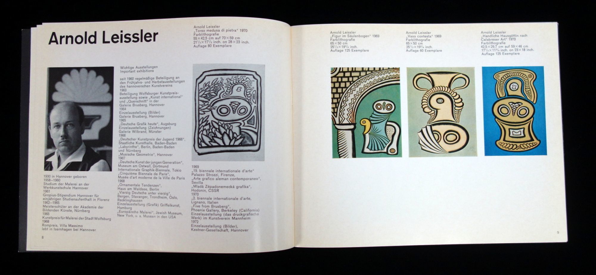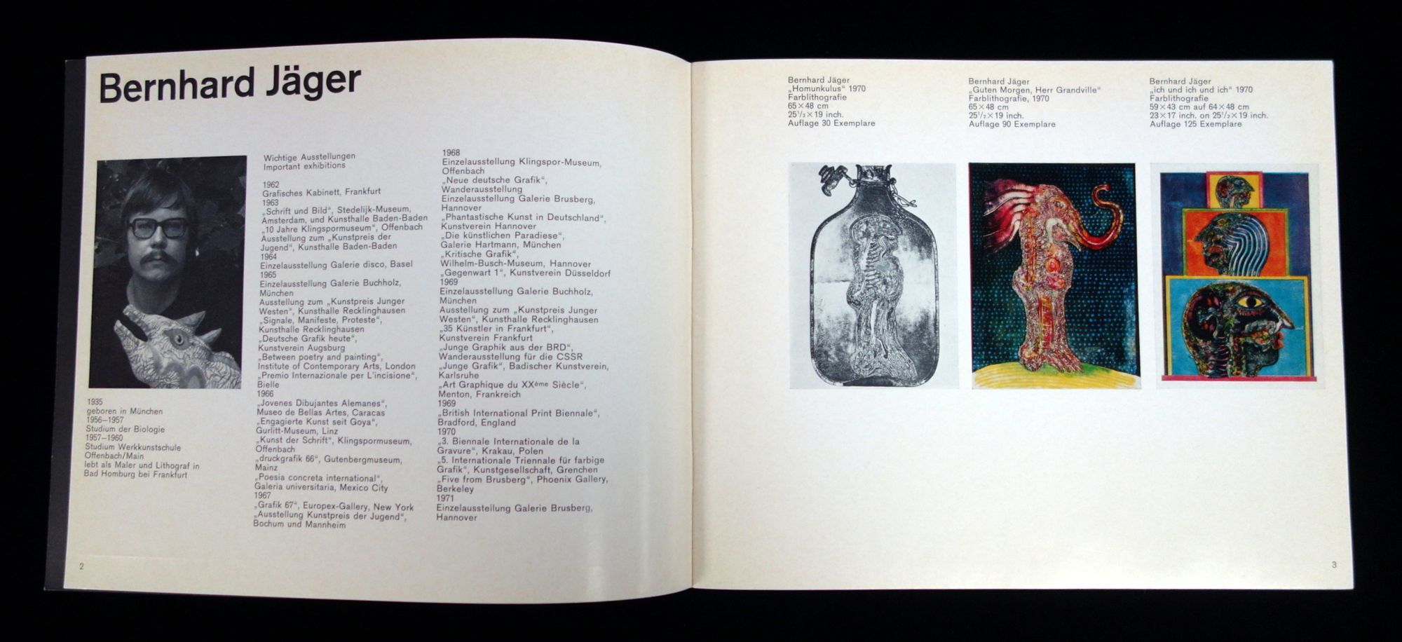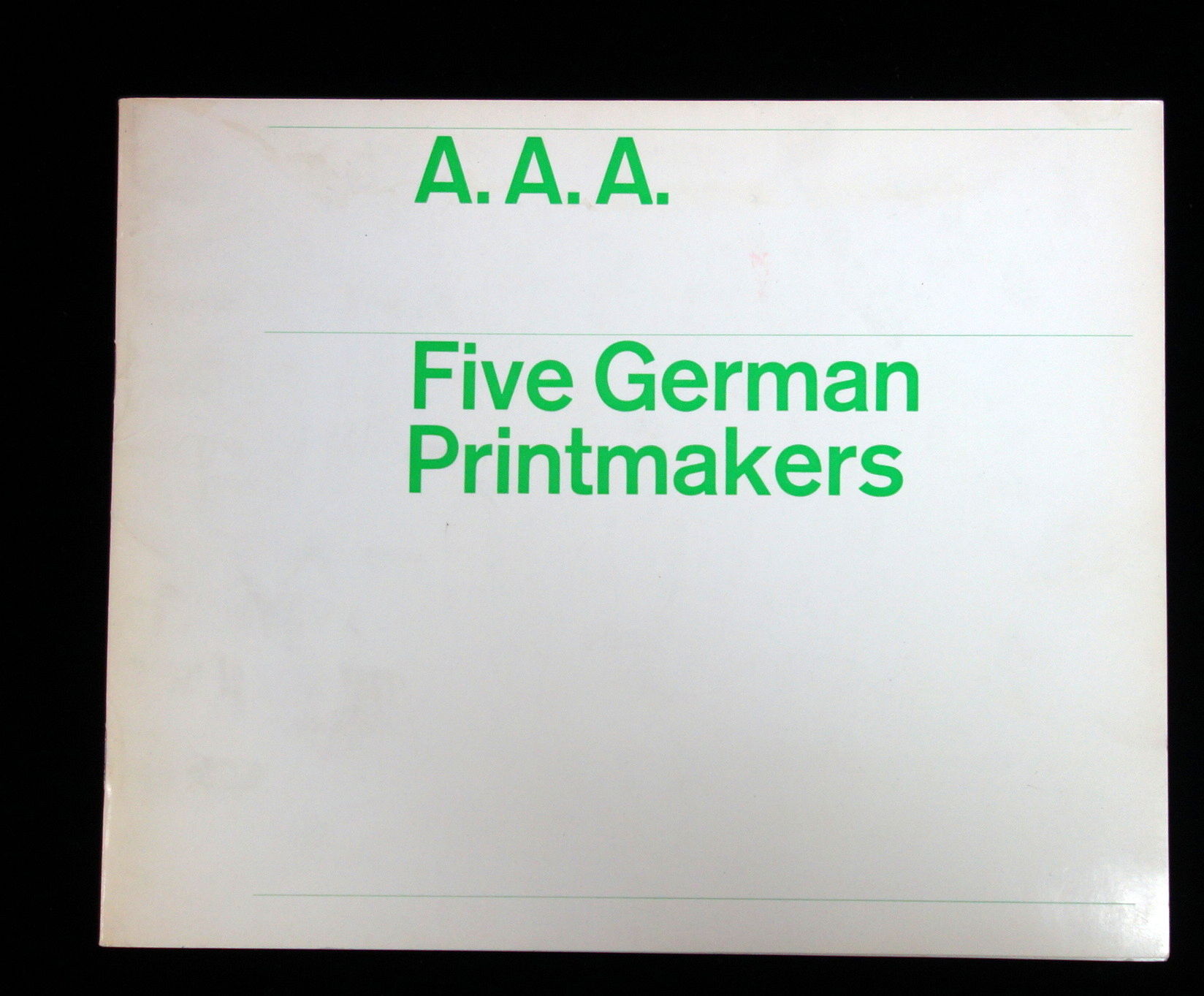 Subject Matter: Gallery Exhibition, printmaking, German printmaking. A catalog of a show of German print makers that ran from January 25th to February 15th 1971. Artists included are Bernhard Jäger, Arnold Leissler, Wolfgang Oppermann, Reiner Schawrz, and Jan Voss. Each artist has a short description about them including basic facts, and a list of other important exhibitions they have been in. Each artists have several pieces in the catalog, shown in both color and B&W photographs. Included are separate price list of each piece, an order form, and an 'errata' note. Written in German. Slight cover wear, and the interior pages have minimal toning and soiling. 9" x 7 1/4