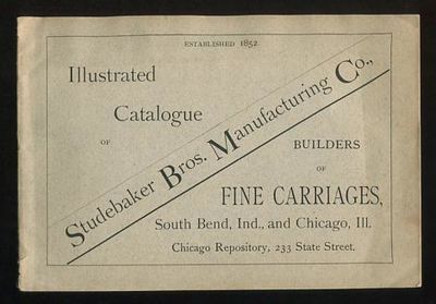 South Bend IN/Chicago: Studebaker Bros. Manufacturing Co.. Very Good+. 1883. Unstated ed. Printed wraps. [quite a decent copy, with small tears/splits at both ends of spine, some uneven age-toning and light soiling to front cover, but no other significant wear]. (B&W engraved illustrations) 26-page booklet illustrating the various types of horse-drawn carriages made by Studebaker, with great names: the One-Man Windsor Wagon; the End-Spring Piano-Box Buggy; the Lawrence Phaeton on End-Springs; etc. There are twenty-one models depicted (each on its own page), with additional pages devoted to "Rules for the Care and Preservation of Carriages," "The Horse," and "The Stable." .