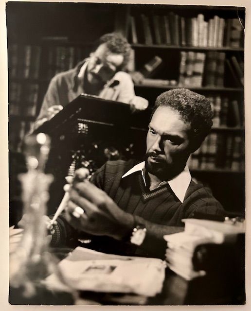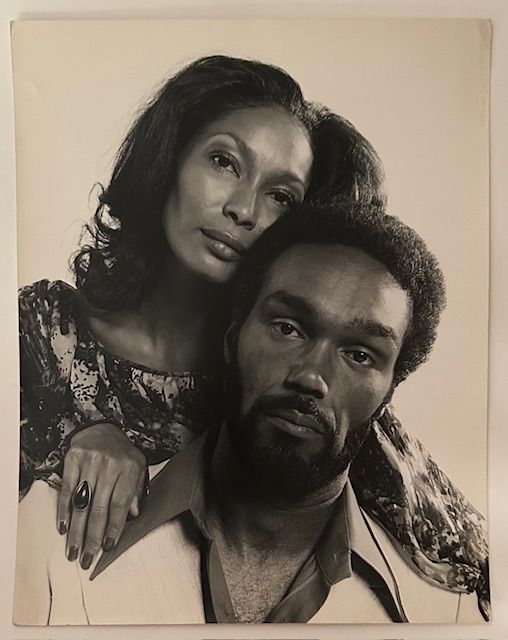 1973. Photograph. Near Fine. 3 rare photos of the great Duane Jones (1937-1988), the lead actor in 1968's beyond-seminal "Night of the Living Dead". The 3 photos are from Jones's next --and only other-- starring film role, the 1973 American black horror film "Ganja & Hess". The photos were taken by renowned jazz photographer Charles Stewart (1927-2017) and each boasts Stewart's professional stamp at the rear. 1 of the 3 photos features Jones with his co-star, the actress Marlene Clark, and the other 2 show Jones either in a scene from the film or in preparation for a scene. The oversized black-and-white photos each measure 11" wide x 14" tall and have held up very nicely. Each is clean, bright and very sharp. Only the portrait of Jones with the dark backdrop shows a bit of creasing and one small closed tear along the lower-edges. An important piece of 1970s underground film ephemera, even "blacksploitation cinema" and the subgenre of black vampire films. Mostly though, the photos represent a recogonition of the actor whose power and influence (embodied in his performance in "Night of the Living Dead") film historians still struggle --well over 50 years later-- to put in its proper place.