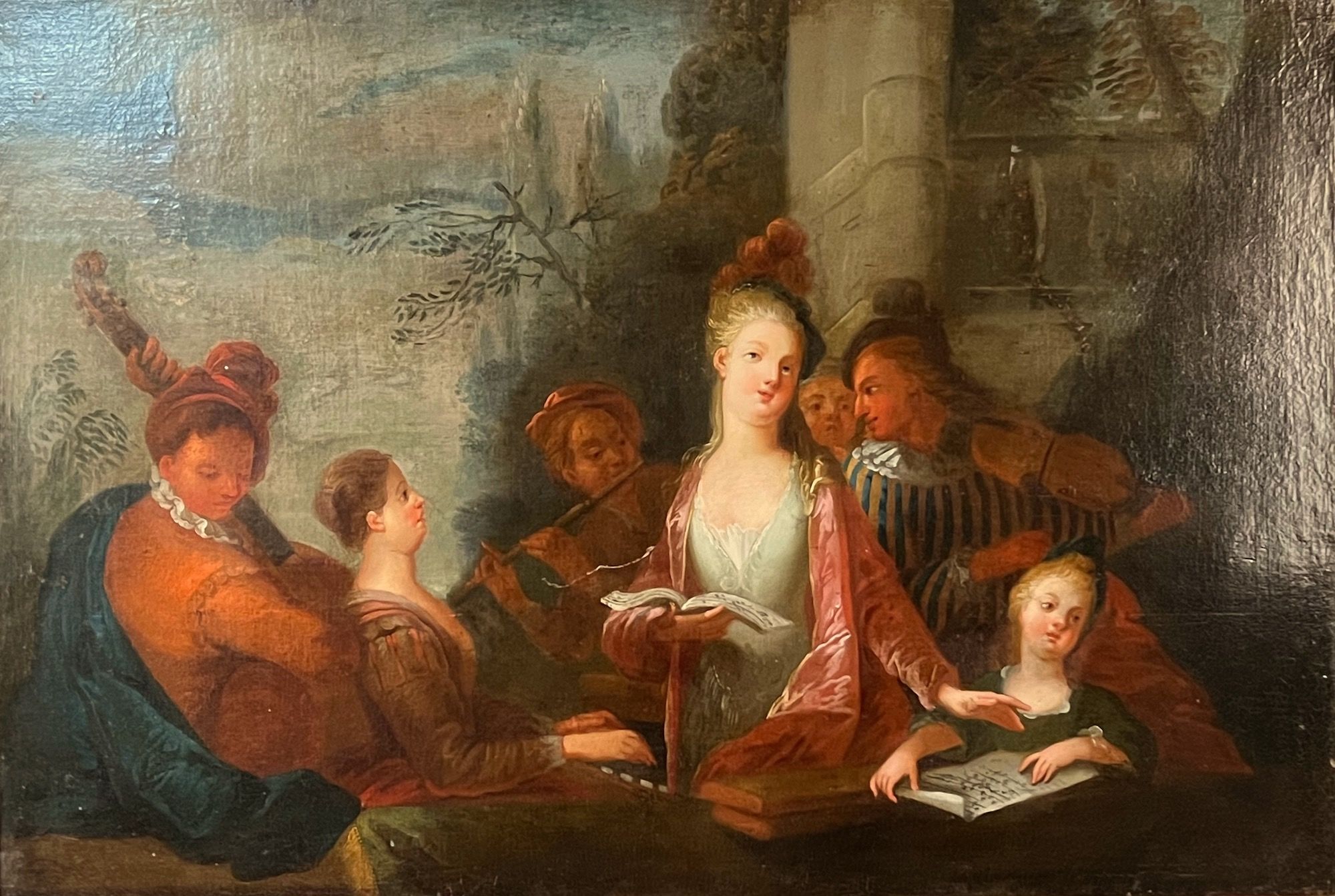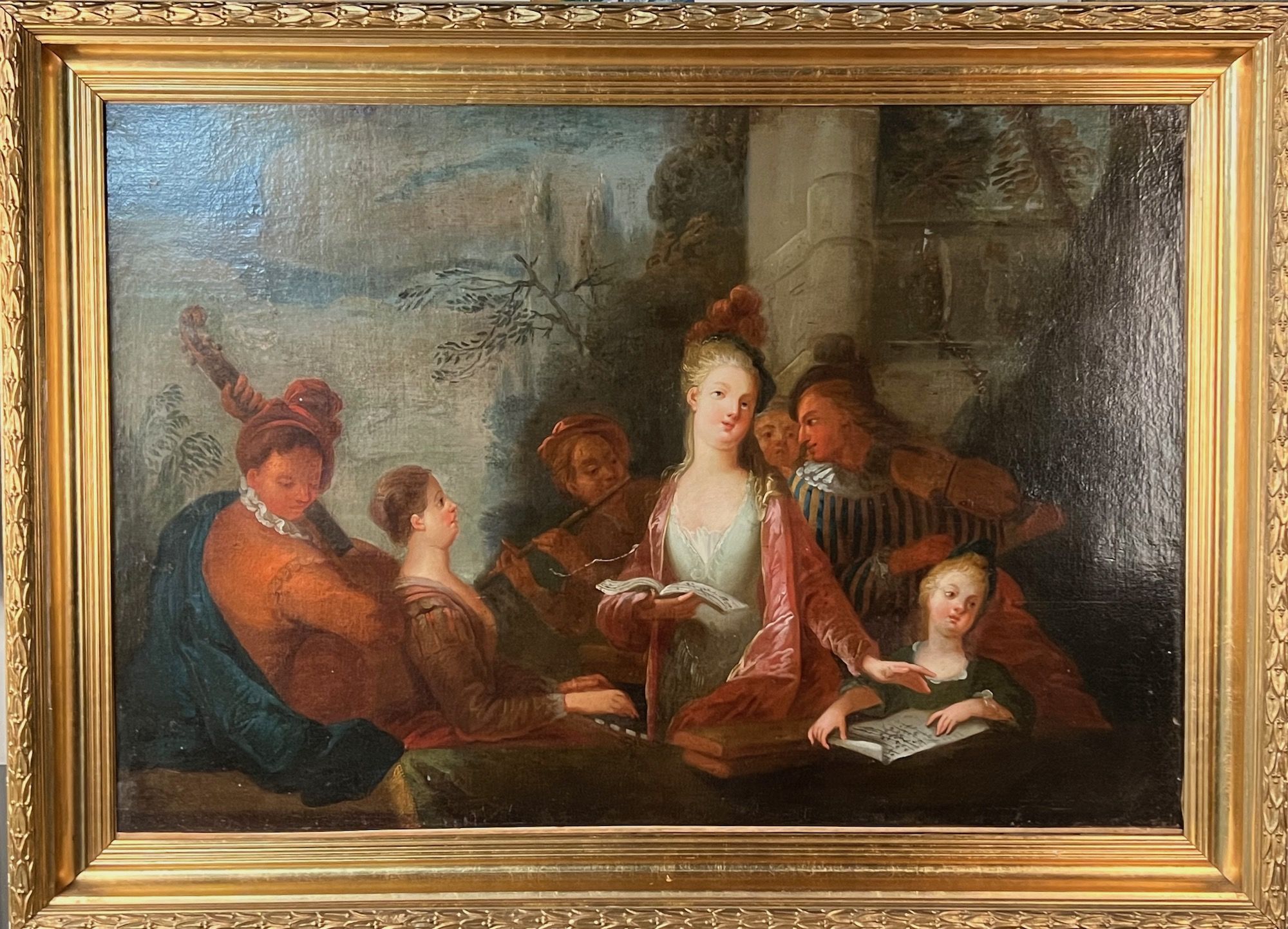 A Concert in an Italianate Garden. Fine oil painting on canvas of a young woman singing in a garden setting surrounded by musicians. Unsigned. French, 18th century