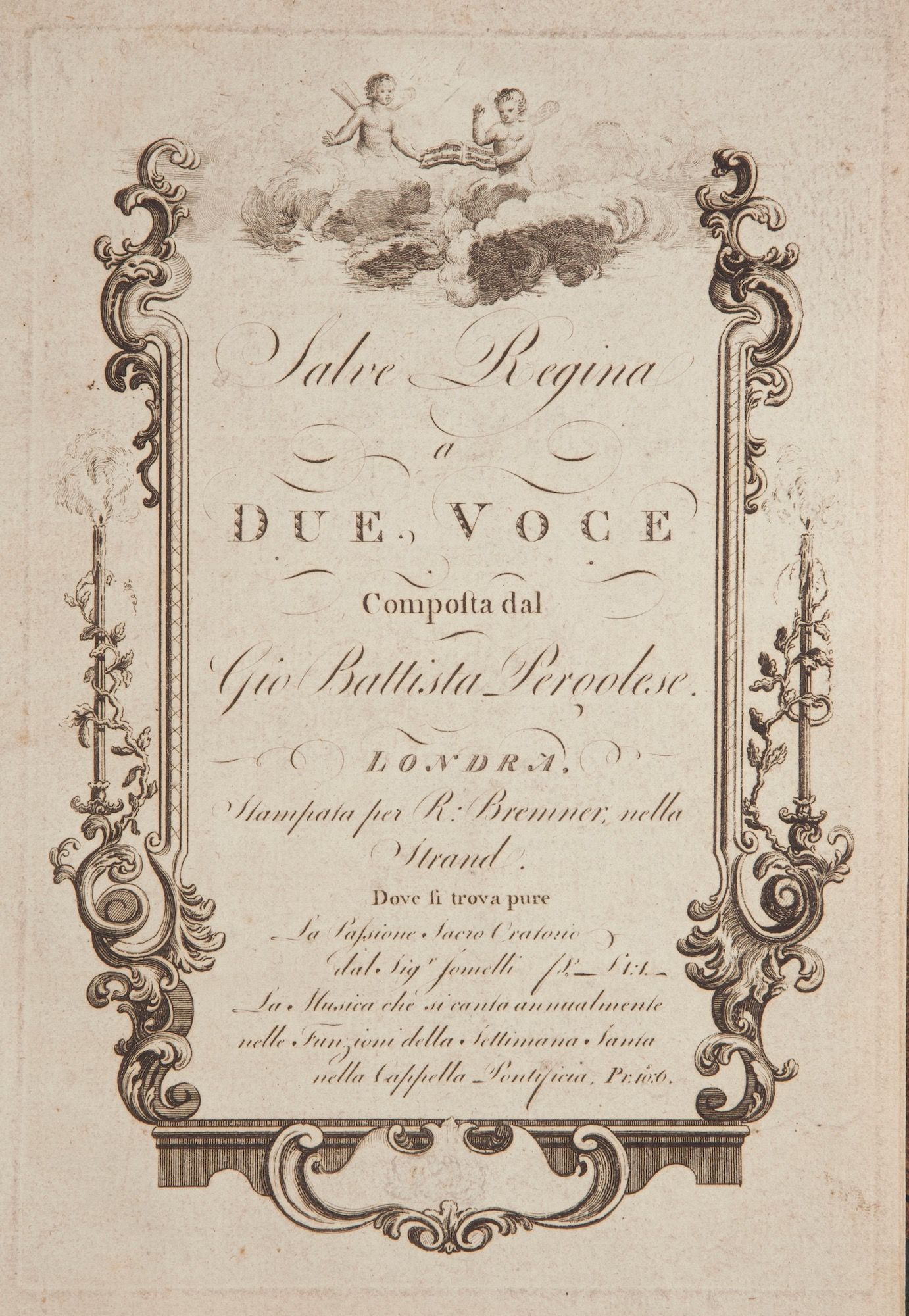 Londra: Stampata per R. Bremner, nella Strand, 1773. 1f. (recto title within decorative border incorporating two angels on a bed of clouds holding an open book of music, verso blank), [i] (blank), 2-21, [i] (blank) pp. Engraved throughout. Title slightly browned and soiled; occasional small stains; blank verso of final leaf soiled. BUC p. 771. RISM P1388. Scored for two sopranos, two violins, and basso continuo.