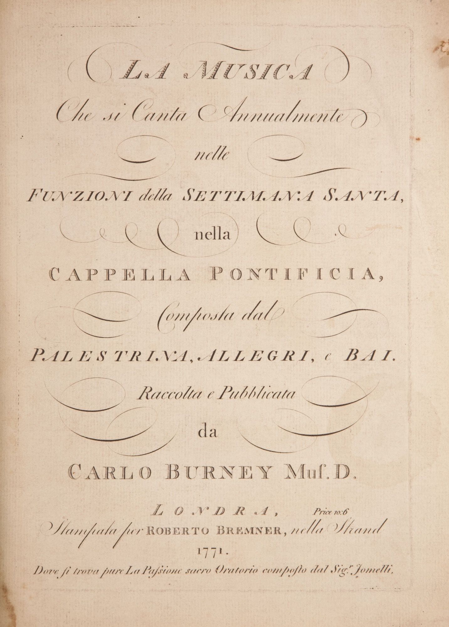 La Musica Che si Canta Annualmente nelle Funzioni della Settimana Santa nella Capella Pontificia ... Raccolta e Pubblicata da Carlo Burney Mus. D. ... Price 10:6. Londra: Stampata per Roberto Bremner, nella Strand, 1771. 1f. (recto title, verso blank), [iv] (typset "Preface by the Editor"), 41 pp. First Edition in this form. BUC p. 143. OCLC 27100429. Marginal staining and mild soiling to title and verso of final leaf.