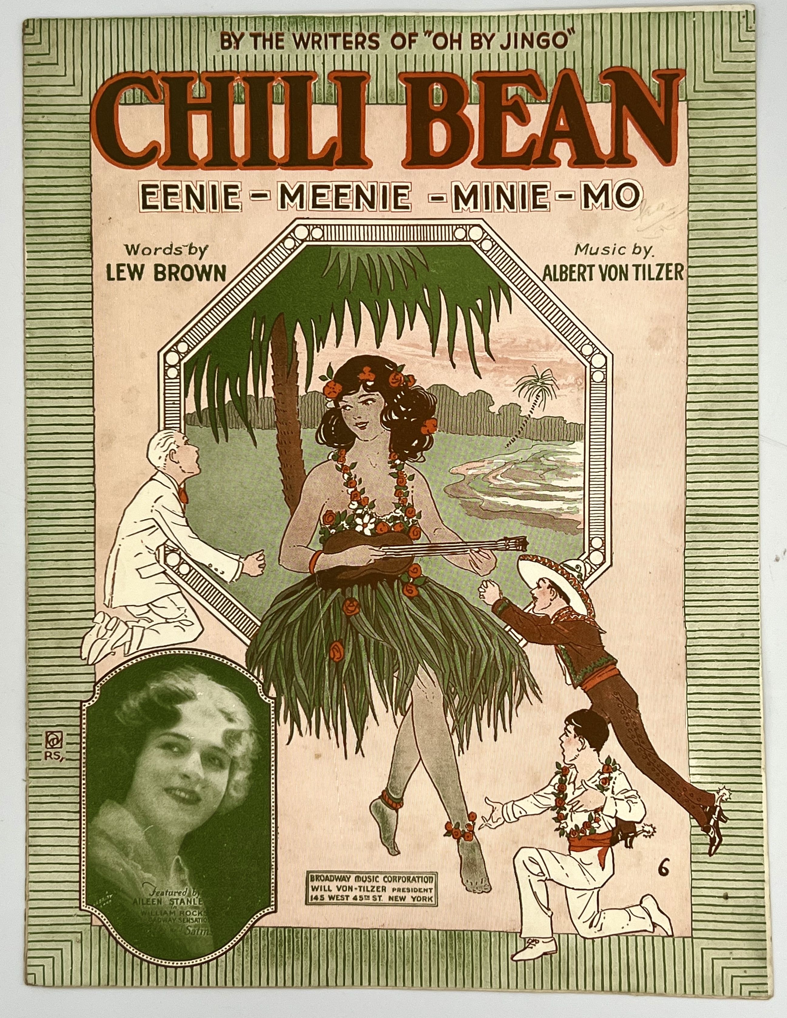 New York: BROADWAY MUSIC CORPORATION, 1920. Loose_leaf. Color illustrated wraps. Very good. 5 pages. 30 x 23 cm. Frolicking Hawaiian themed illustration with black and white photo inset of Aileen Stanley. Light soiling on rear cover, otherwise clean.