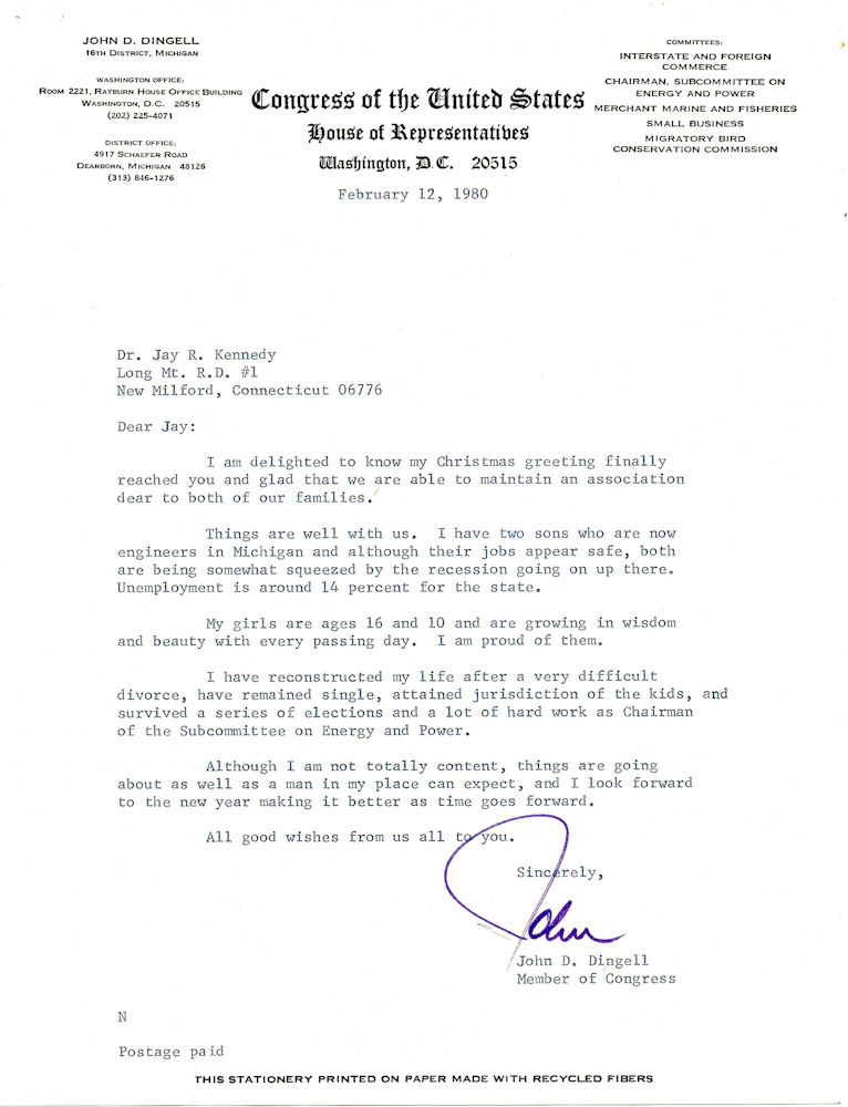 Washington, 1980, 1988, 1991. Letter. Light creases from mailing. Fine. Three TYPED LETTERS SIGNED "John" on House of Representatives stationery to Jay Richard Kennedy. In the two later letters Dingell congratulates Kennedy and sends good wishes. The earliest letter from 1980 has more revealing content. In part: "I have two sons who are now engineers in Michigan and although their jobs appear safe, both are being somewhat squeezed by the recession going on up there. Unemployment is around 14 percent for the state.... I have reconstructed my life after a very difficult divorce, have remained single, attained jurisdiction of the kids, and survived a series of elections and a lot of hard work as Chairman of the Subcomittee on Energy and Power. Although I am not totally content, things are going about as well as a man in my place can expect, and I look forward to the new year making it better as time goes forward." John Dingell holds the record as the longest-serving member of Congress in American history (1955-2015). His widow, Deborah Ann Dingell, whom he married the year after this letter was written, took over his seat in Congress in 2015 and continues to serve in that capacity. Two of the three envelopes are present.