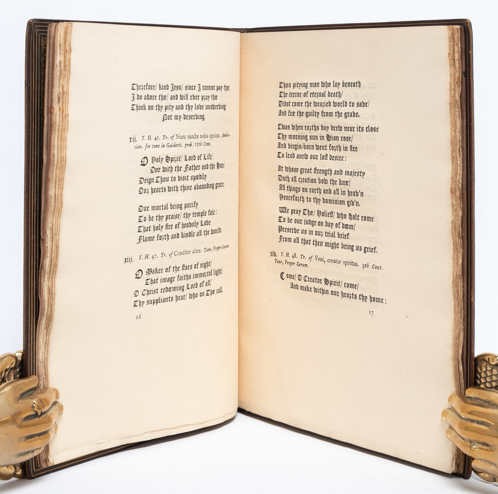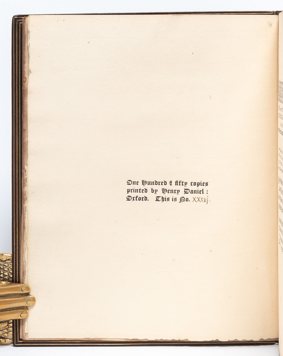 Oxford: Henry Daniel, 1899. First thus. Near Fine. Limited to 150 copies, this number 36. Printed in black letter. Finely bound by Zaehnsdorf in a modernist style, likely for exhibition (with their circlular stamp on the rear silk paste-down). Bound in full dark brown crushed morocco. Interwoven rules create a central panel on the front and rear boards, similar, but smaller patterns in the spine panels. Top edge gilt, others untrimmed, ruled inner dentelles, dark brown silk end papers. Spine a bit toned and few bookseller notations to the verso of the front end paper. Clean and fresh throughout. Quarto (leaves 228 x 172), collating: [iv], 64,[x], complete.