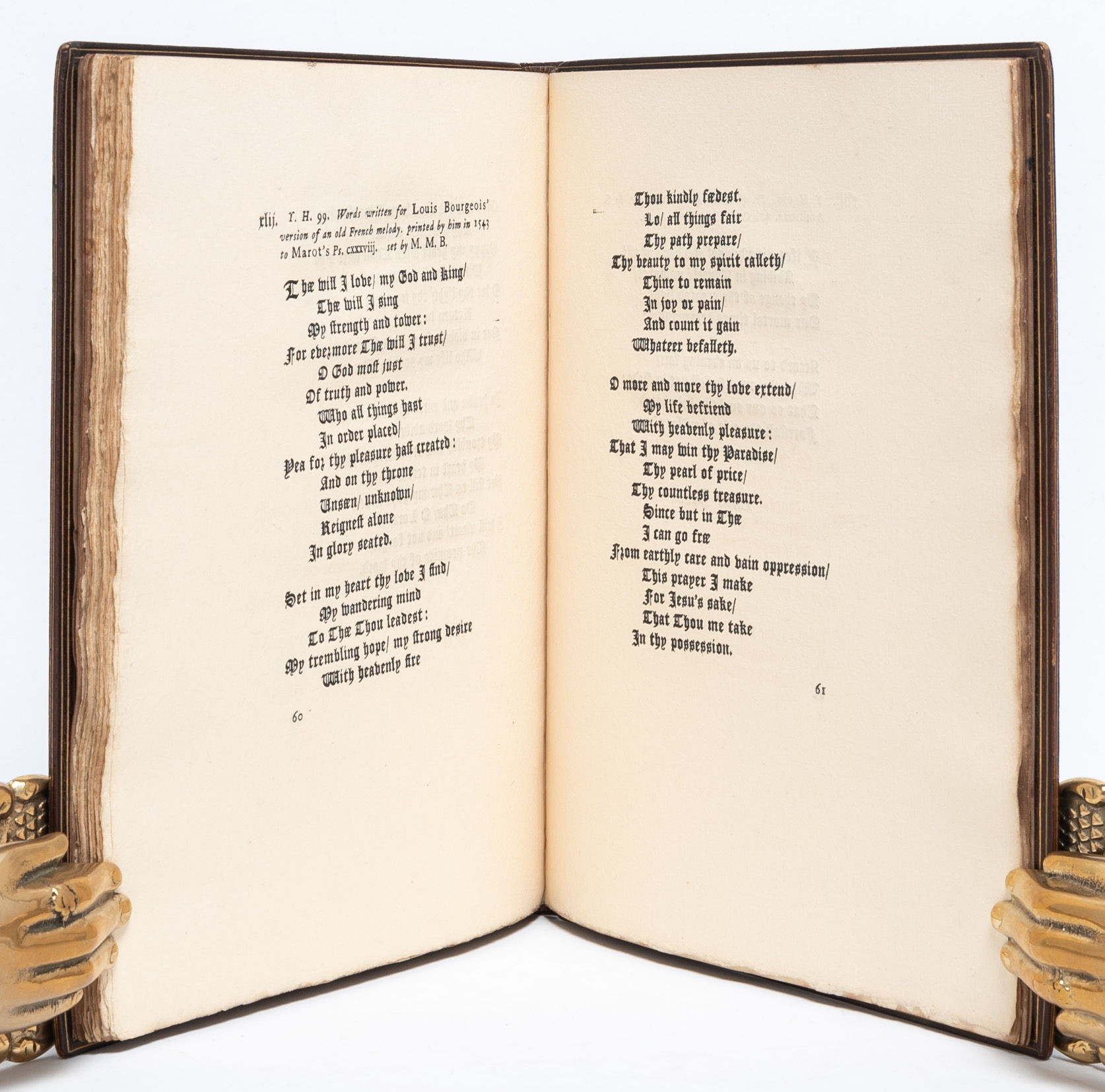 Feeling that current church music has become to worldly, the late-Victorian poet Robert Bridges was driven to create music that reached for something beyond the realm of man. To achieve his revivalist goals, Bridges collaborated on the project with musical scholar H. Ellis Wooldridge and his wife, the pianist Monica Bridges to write news hymns for their parish church in Yattendon. Even the printing of the hymns reflected 16th century book production and typography transporting the reader to another time and place.
