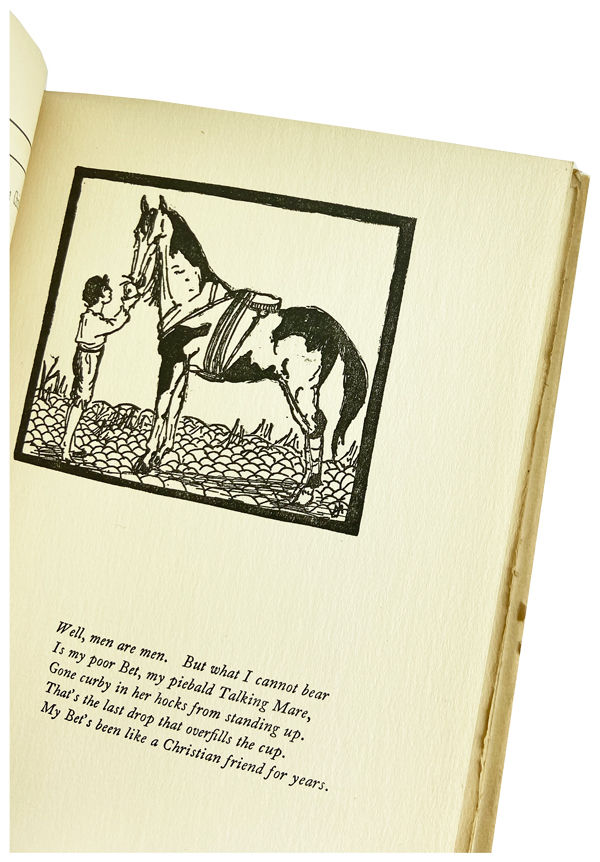 New York: Macmillan Company, 1921. Very Good/Very Good. New York: The Macmillan Company, 1921. First edition. Octavo (19.8cm), [88]pp. Includes eight illustrations by John Masefield's daughter, Judith. Price-clipped, cream publisher's dust jacket with orange and black stamping on front and spine. Boards half bound in blue paper and navy cloth with pasted labels on both the front and spine. Pages unopened, deckled, and untrimmed on the bottom edge. Top stained. Dust jacket soiled on both the front and back covers. Joints, top margins, and spine significantly darkened. Some minor loss and tears to the top and bottom of the margins, joints, and spine edges. Inside front flap has the bottom cut away to clip the price. Inside of dust jacket lightly soiled. Corners of boards and head and tail of book spine bumped. One minor spot on front cover and top stained edge faded. Front flyleaf has some fingerprint soiling, as does the top of the back flyleaf. All other pages clean. Well bound father-daughter project scarce in its dust jacket.