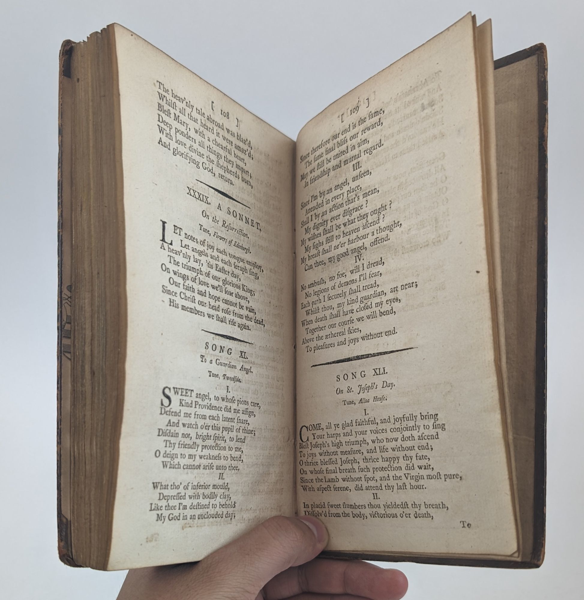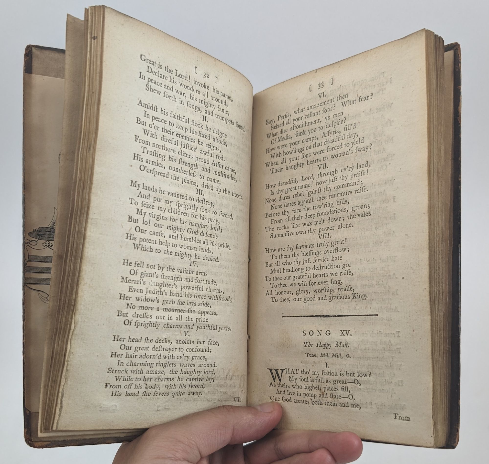 [Aberdeen]: [J. Chalmers], 1791. Hardcover. 12mo, 110 pages. In Good condition. Bound in period full brown leather with label bearing gilt titling to spine. Boards show significant cracking along joints, with general rubbing and scratching to boards and several areas of staining to upper portion of front board and center spine are of rear board. Text block shows light plus general age toning. An ex-library copy, with library bookplate covering majority of front board. Early handwritten text contextualizing the volume pasted to front free endpaper. ESTC: T185024. EH Consignment. Shelved in Room G. 1380956. Special Collections.