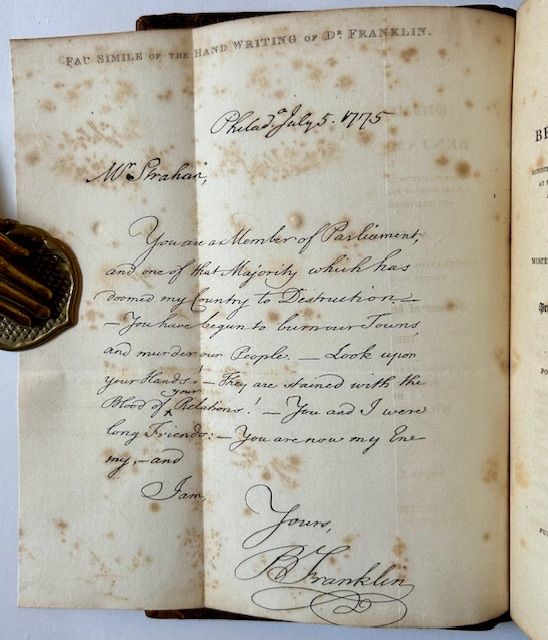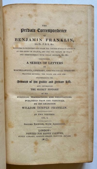 London: Henry Colburn (William Temple Franklin), 1817. Full leather. Very Good +. The 1817 2nd edition, "with additions", complete in 2 volumes. Printed for Henry Colburn of London, "published from the originals by Benjamin Franklin's grandson, William Temple Franklin". A handsome set, both volumes professionally re-backed in an elegant dark-brown by the Currier Bindery of Newport, Rhode Island, while maintaining the publisher's oriinal calf boards. Solid, tight and VG, with very mild soiling/streaking along the fore-edges, very mild abrading and ceasing along the spines. A bit of light, frgiveable foxing, otherwise very clean internally. Octavos, fold-out frontispiece to Vol. I. (Continuing from the title page: "Comprising Series of Letters of Miscellaneous, Literary, and Political Subjects: Written Between the Years 1753 and 1790; Illustrating the Memoirs of His Public and Private Life, and Developing the Secret History of His Political Transactions and Negotiations."). (Sabin 25571).