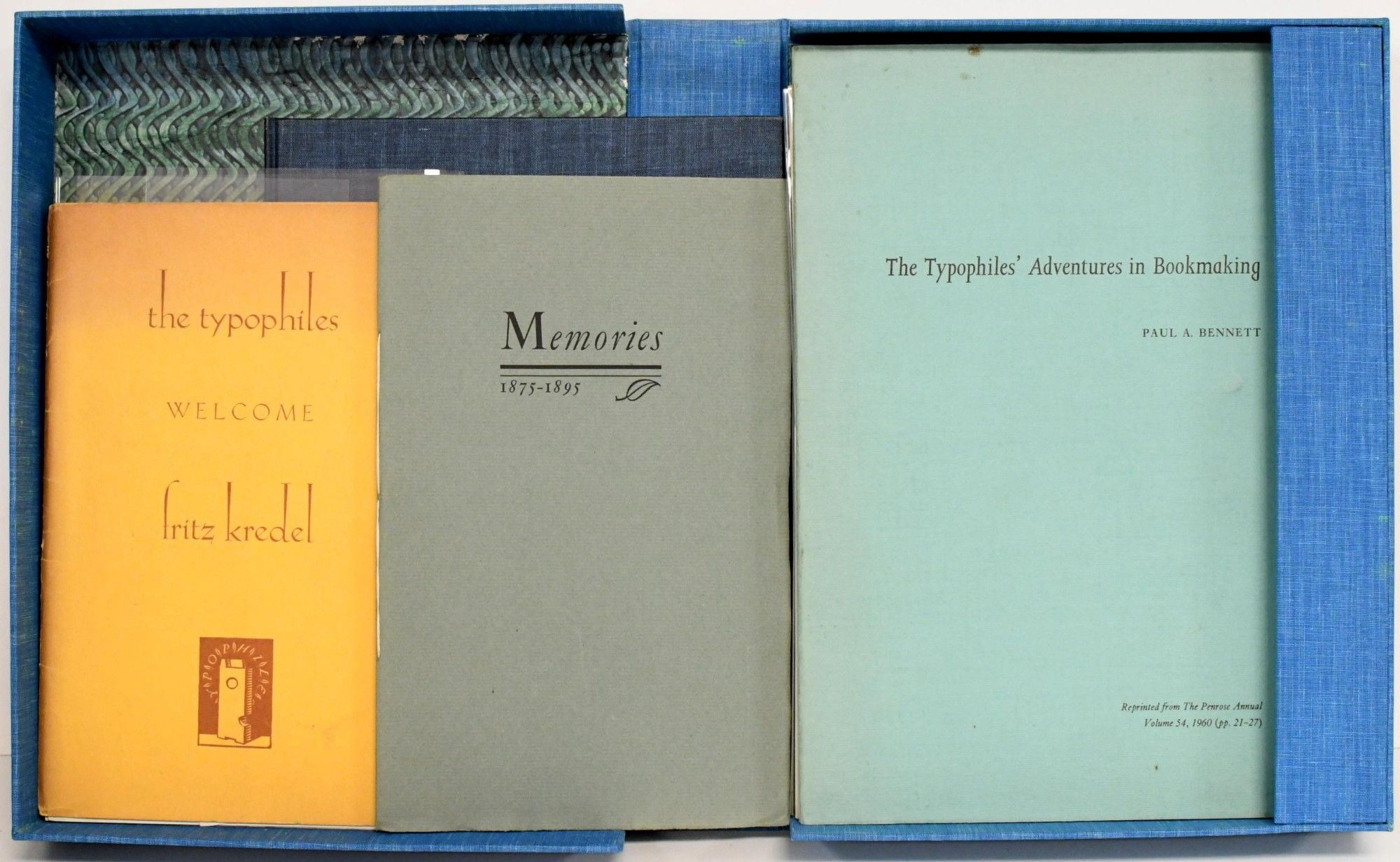 A gathering of imprints by and relating to the Typophiles Club, housed in a bespoke blue cloth covered dropback box, with a morocco label. Included are: ~1. Welcome Fritz Kredel in portfolio: [an impression of the city, by Hans Alexander Mueller;[Greeting from George Salter];Good friends, greetings! -- Fritz Kredel,[Warren Chappell] ; Die Seelenwanderung [by Warren Chappell]; Fritz Kredel : a word of welcome on the occasion of the dinner given in his honor by the Typophiles in New York, October 4th, 1938; Greetings to Fritz Kredel upon his first visit to America,R. Hunter Middleton; and a ticket to present at the dinner.~2. Typophiles Salute Paul Beaujon [Beatrice Warde]. Portfolio with cover detached: The fourth Typophiles Keepsakes, containing materials saluting British book designer Beatrice Warde, including iInviatation to a dinner, a handbill, a folded car in a kind of acrostic; Stags to a Few Dears; and a half-tone portrait from a drawing by Eric Gill (tipped in printed folder but detached).~3. Paul Bennett. Wood Engraving and Engravers~4. Issue of The New Colophon Containing Deoch Fulton's The Typophiles;~5. Broadside by Fritz Kredel and George Salter saluting Paul Bennett~6. Enoch Fulton; The Typophiles ~7, Paul Bennett; The Typophiles; Adventures in Bookmaking~8. Will Bradley. Memories, 1875-1895 (signed).~~.