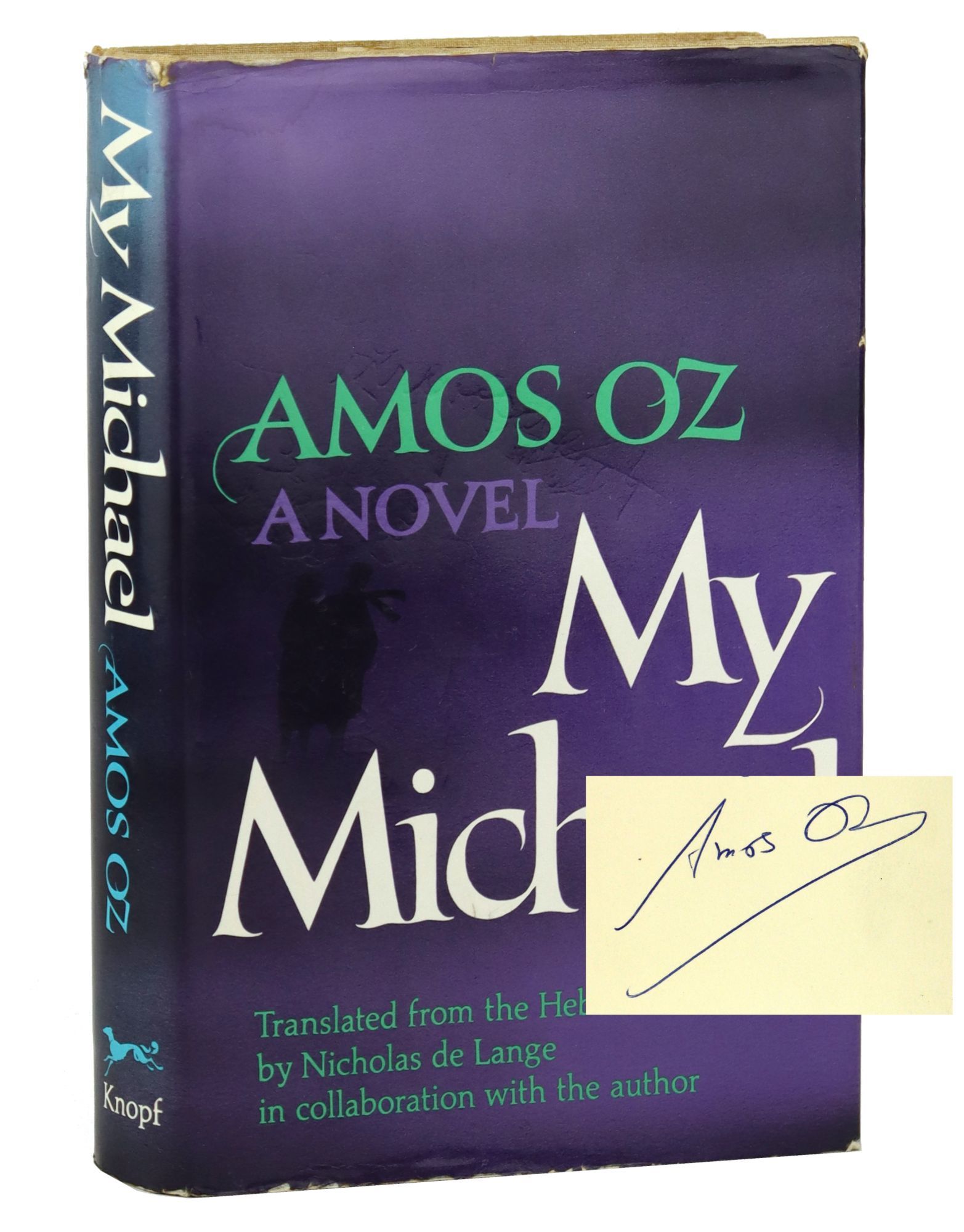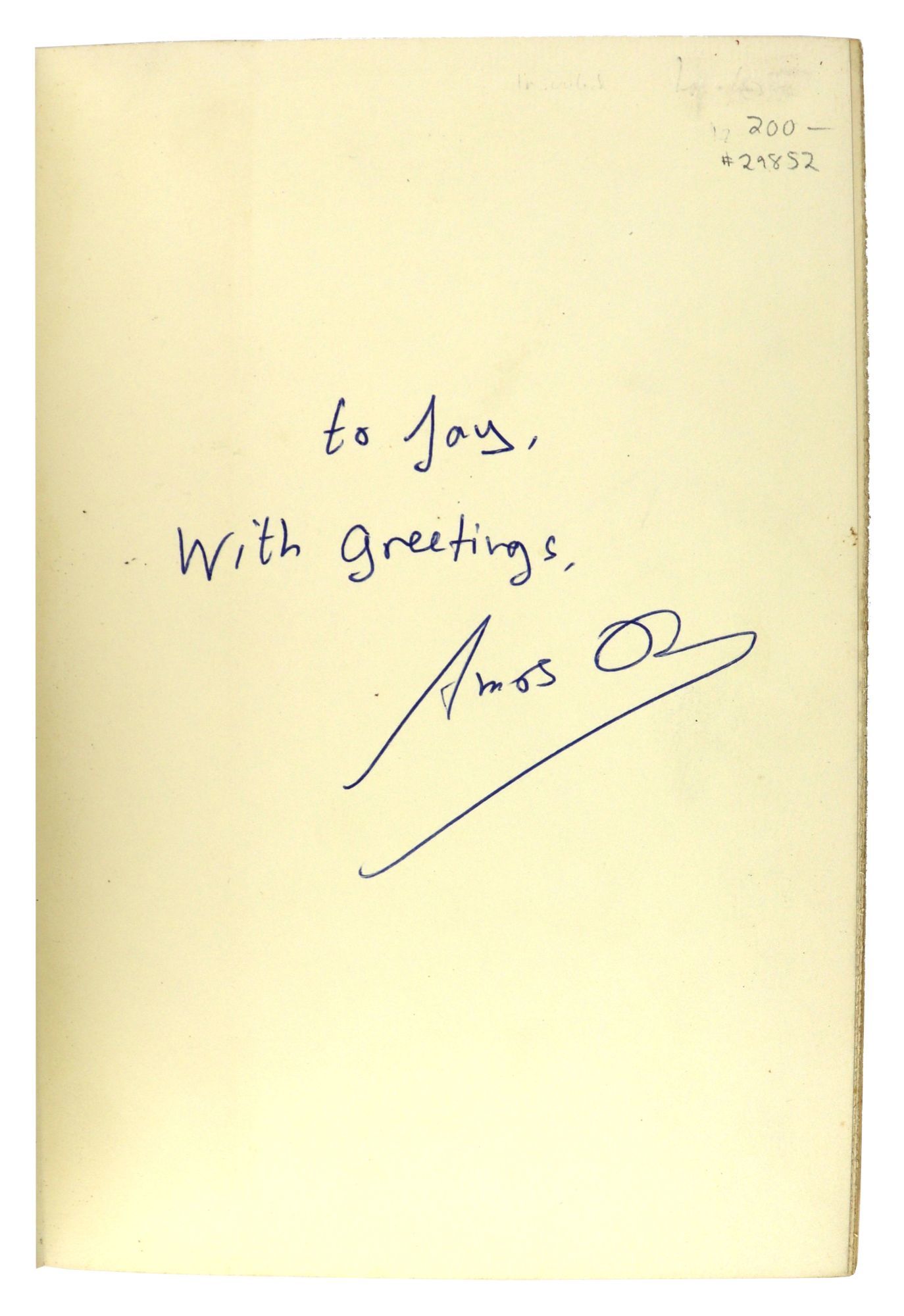 New York: Alfred A. Knopf, 1972. Very Good -/Very Good -. New York: Alfred A. Knopf, 1972. Third printing. Signed by Amos Oz with brief inscription at front free endpaper. Octavo; 287pp. Illustrated dust jacket with $6.95 price intact; boards in white cloth with green and gilt lettering and design. Jacket dampstained and soiled along top and bottom edges; edgeworn with a few nicks. Boards spotted and soiled along edges; minor bumping and nudging to corners. Binding sound. Foxing and a couple faint waterspots to top edge of textblock. Interior unmarked. A Good to Very Good copy.