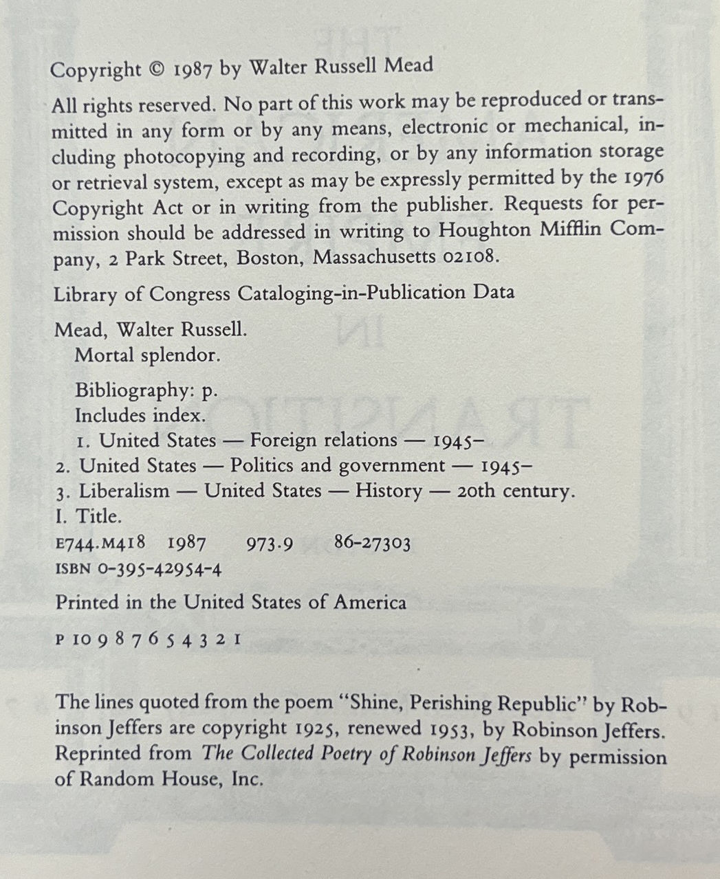 Boston: Houghton Mifflin Company, 1987. First Edition. Hardcover. Fine/Fine. Near Fine in an about Fine jacket, unclipped ($19.95), a few scuffs on the spine. Quarter grey buckram with black paper on the boards, faded at the fore-edge. Square and firmly bound, one stain at the fore-edge, clean internally. Mead's history of "the rise of America's liberal world empire, its golden years from World War II until the mid 1960s, and its continuing decline since then.