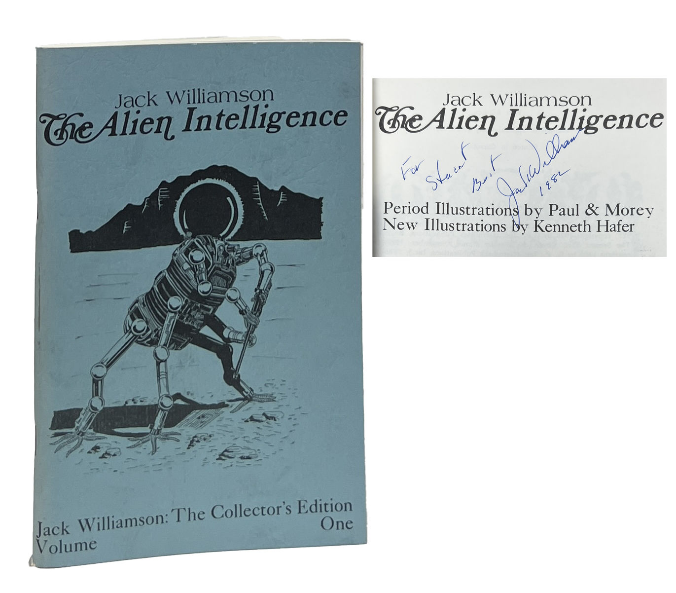 Carrollton: P.D.A. Enterprises, 1980. First Edition. Hardcover. Near Fine/Very Good. Period illustrations by Paul & Morey. New Illustrations by Kenneth Hafer. Limited to 1,000 copies, this copy inscribed by Williamson on the title page. Near Fine. Blue wraps, faintly rubbed, a few stray stains. Square and firmly bound with two staples, clean internally. The first volume in the Jack Williamson Collector's Series, this features an introduction by Williamson as well as three of his stories: "The Alien Intelligence," "The Second Shell," and "The Prince of Space.