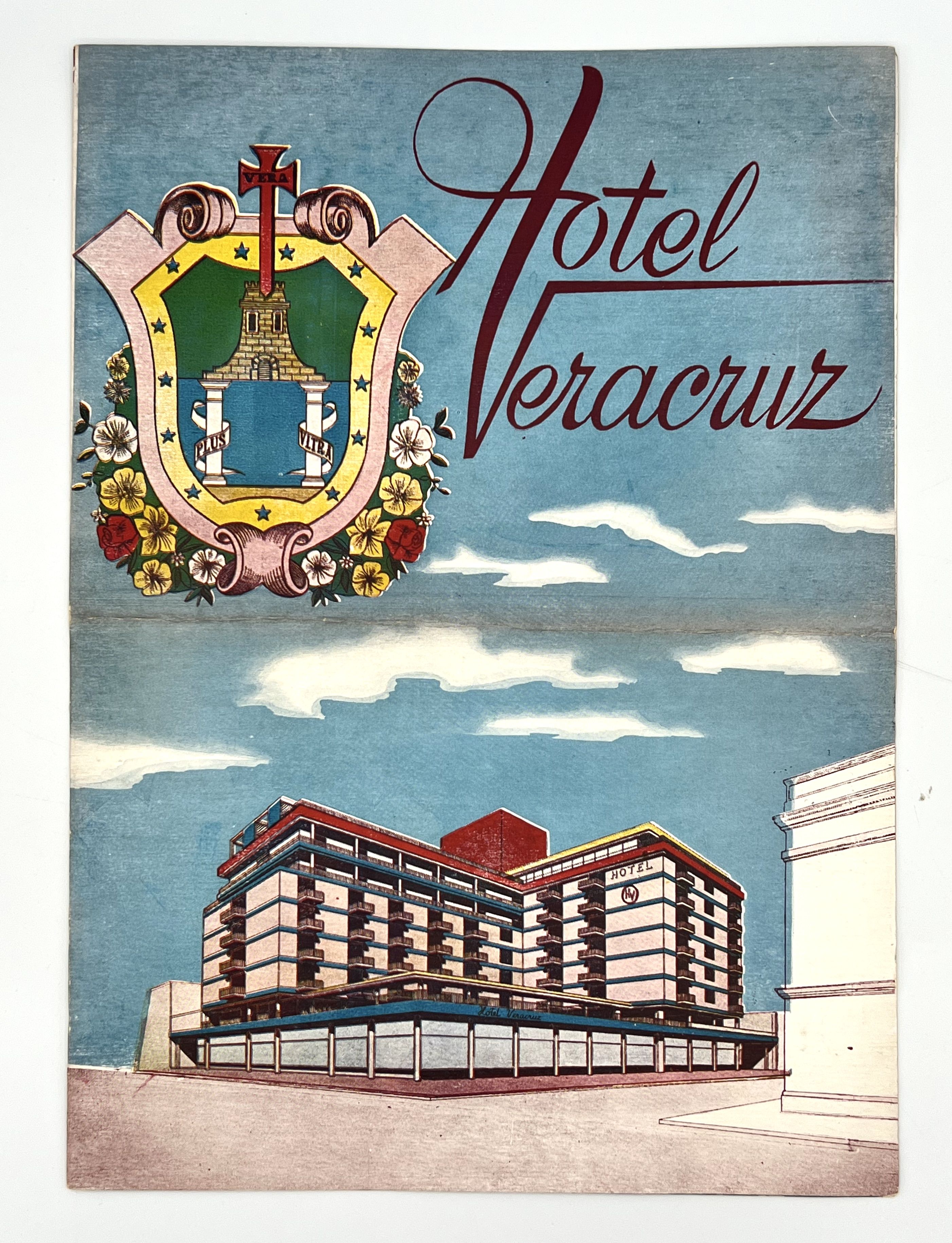 Veracruz, Mexico, c. 1965. Cards. Color illustrated cards. Very good. 32.5 x 25.5 cm. A large format cocktail menu with an extensive selection of wines, whiskeys, vermouth, beer, and cocktails. Visible crease to center, otherwise clean.