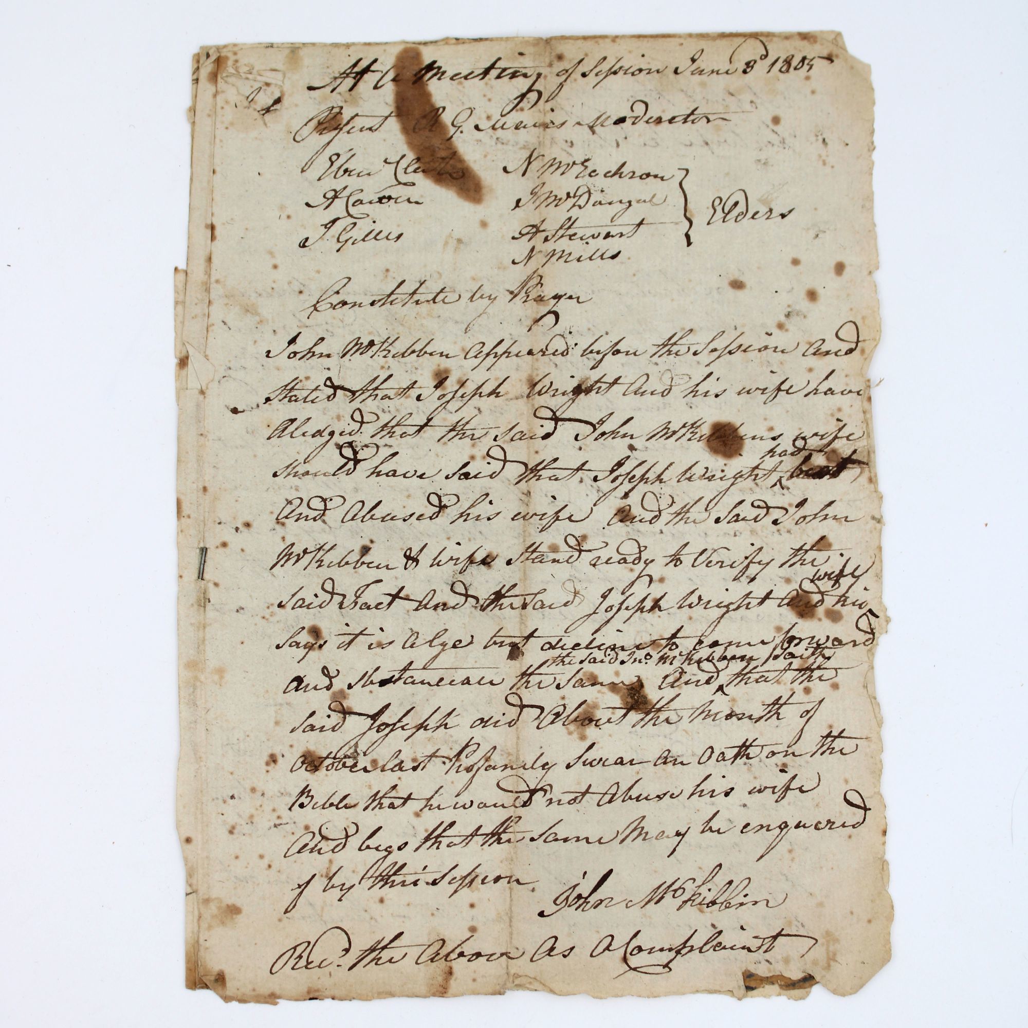 [Argyle, NY], 1805. 6pp. Small 4to. Pinned together at an early date. Usual folds, minor foxing. 6pp. Small 4to. Much of the minutes of two meetings of the elders of the Argyle were taken up with the case of Joseph Wright who was accused of beating his wife. The minutes include the testimony of two female witnesses that Wright had beaten his wife with a broomstick, as well as the testimony of another female witness that she had heard rumor that Wright had beaten his wife "because he was jealous with her being great with a Negro & expected that the last child she had would be black...