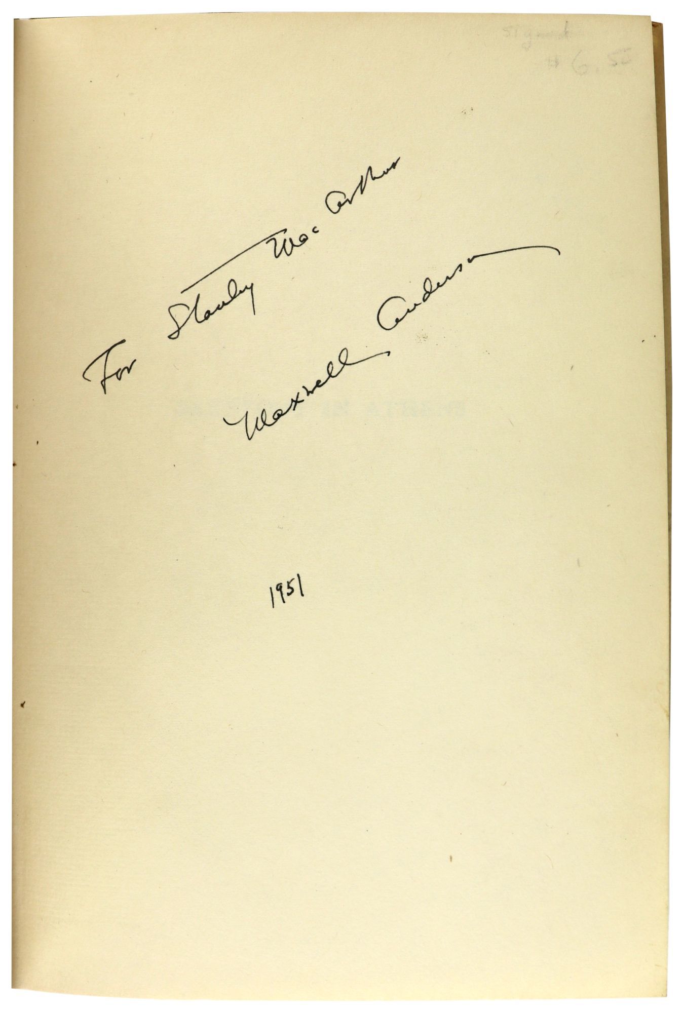 New York: William Sloane Associates, Inc. Publishers / An Anderson House Book, 1951. Very Good/Very Good. New York: William Sloane Associates, Inc. Publishers / An Anderson House Book, 1951. First Edition. Signed by Anderson at front free endpaper with brief inscription to a Stanley MacArthur. Octavo. 101 pp. Printed dust jacket. Blue boards stamped in black. Price-clipped dust jacket toned and worn along edges with a few nicks; general spotting and soiling. Boards faded along edges and spine. Binding sound and pages unmarked; Very Good.
