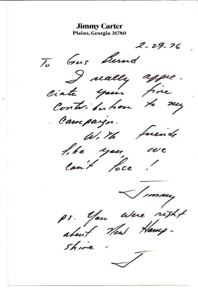 Plains, GA, 29 February 1976. Letter. Minor creases from mailing. Fine. On personal stationery (5-1/2" x 8-1/4") SIGNED by the soon-to-be-president as "Jimmy" to Gus Bernd [Kaufman] with a postscript SIGNED as "J." In full: "I really appreciate your fine contribution to my campaign. With friends like you, we can't lose! Jimmy. ps. You were right about New Hampshire - J." Carter edged out Mo Udall in New Hampshire five days before this letter was written.