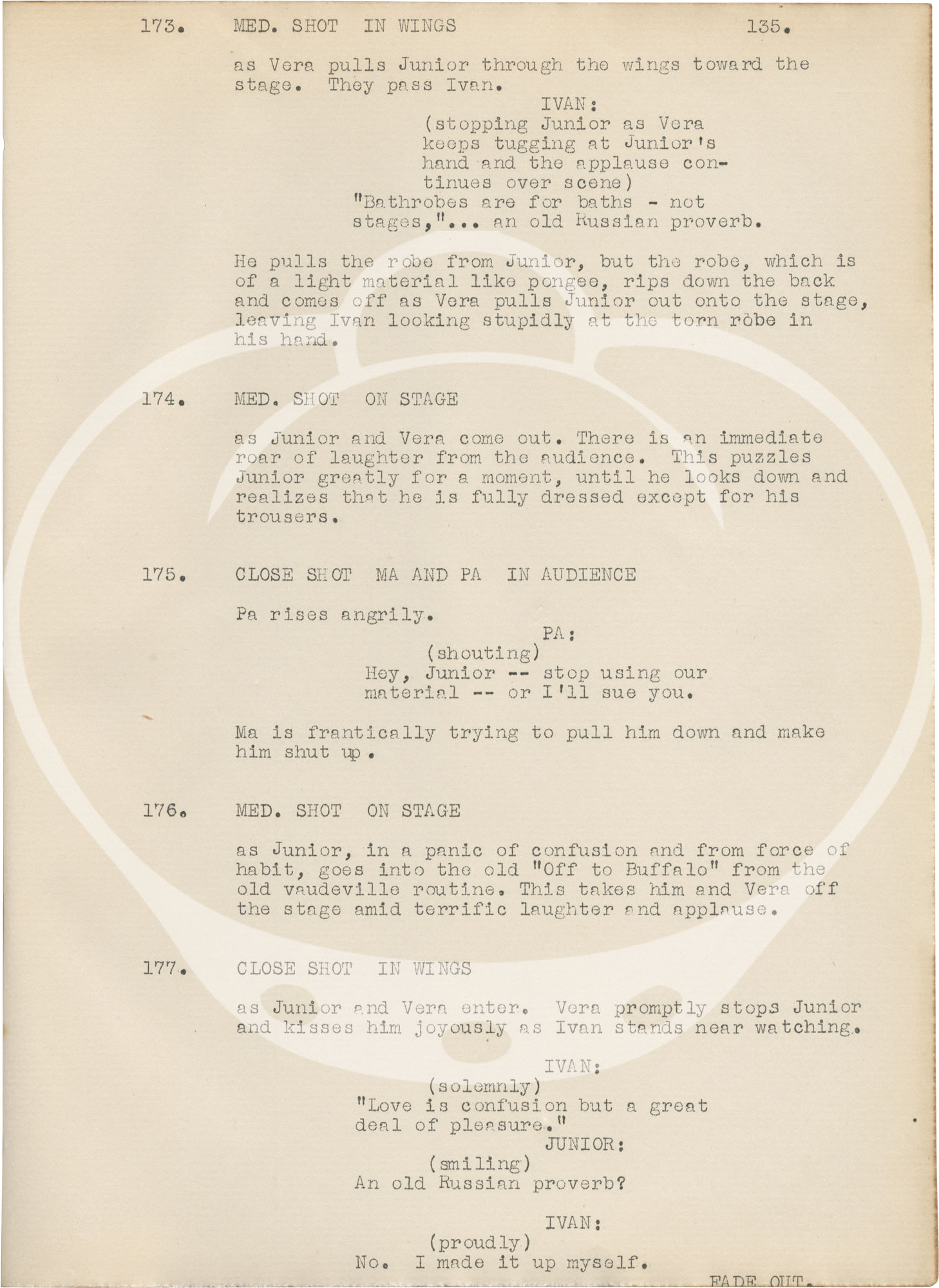 Bound in red cloth with red quarter leather binding, with five raised bands and gilt titles on the spine. Distribution page present, dated 5/5/39 and noted as FINAL, stamped copy No. 102, with receipt intact. Title page present, with credits for screenwriters Jerry Wald and Richard Macaulay and playwrights Richard Rodgers and Larry Hart. 138 leaves, with last page of text numbered 135. Mimeograph duplication, rectos only, with two blue revision pages dated 5/9/39. Pages Near Fine, binding Near Fine.