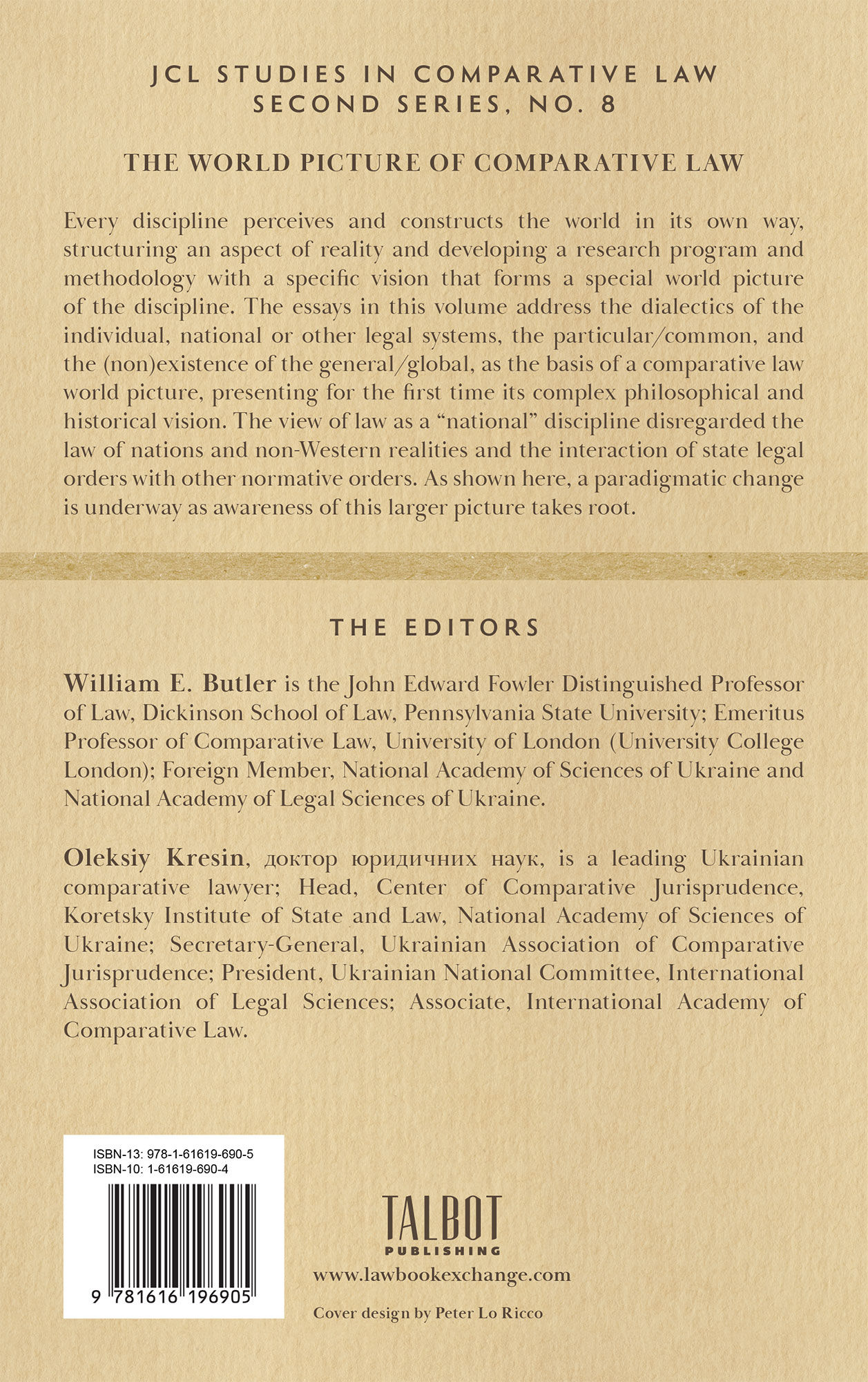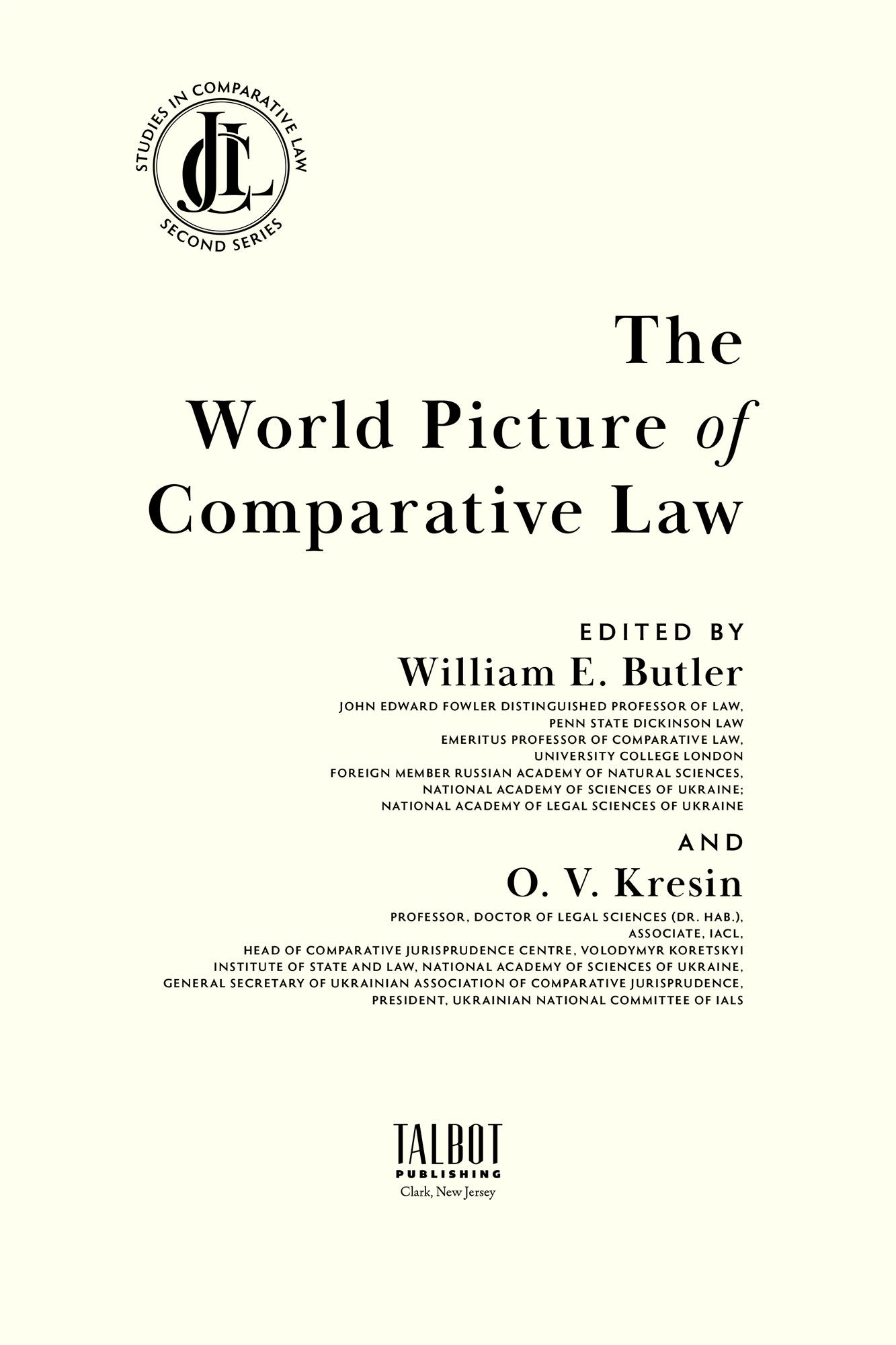 2024. Talbot Publishing, 2024. xi, 694 pp.. Talbot Publishing, 2024. xi, 694 pp. Butler, William E. Editor. Kresin, O.V., Editor. The World Picture of Comparative Law. Clark, New Jersey: Talbot Publishing, 2024. xi, 694 pp. ISBN-13: 9781616196905. ISBN-10: 1616196904. Hardcover. New. $185. * A title in the JCL Studies in Comparative Law, Second Series. Every discipline perceives and constructs the world in its own way, structuring an aspect of reality and developing a research program and methodology with a specific vision that forms a special world picture of the discipline. The essays in this volume address the dialectics of the individual, national or other legal systems, the particular/common, and the (non)existence of the general/global, as the basis of a comparative law world picture, presenting for the first time its complex philosophical and historical vision. The view of law as a "national" discipline disregarded the law of nations and non-Western realities and the interaction of state legal orders with other normative orders. As shown here, a paradigmatic change is underway as awareness of this larger picture takes root. William E. Butler is the John Edward Fowler Distinguished Professor of Law, Dickinson School of Law, Pennsylvania State University; Emeritus Professor of Comparative Law, University of London (University College London); Foreign Member, National Academy of Sciences of Ukraine and National Academy of Legal Sciences of Ukraine. Oleksiy Kresin is a leading Ukrainian comparative lawyer; Head, Center of Comparative Jurisprudence, Koretsky Institute of State and Law, National Academy of Sciences of Ukraine; Secretary-General, Ukrainian Association of Comparative Jurisprudence; President, Ukrainian National Committee, International Association of Legal Sciences; Associate, International Academy of Comparative Law.