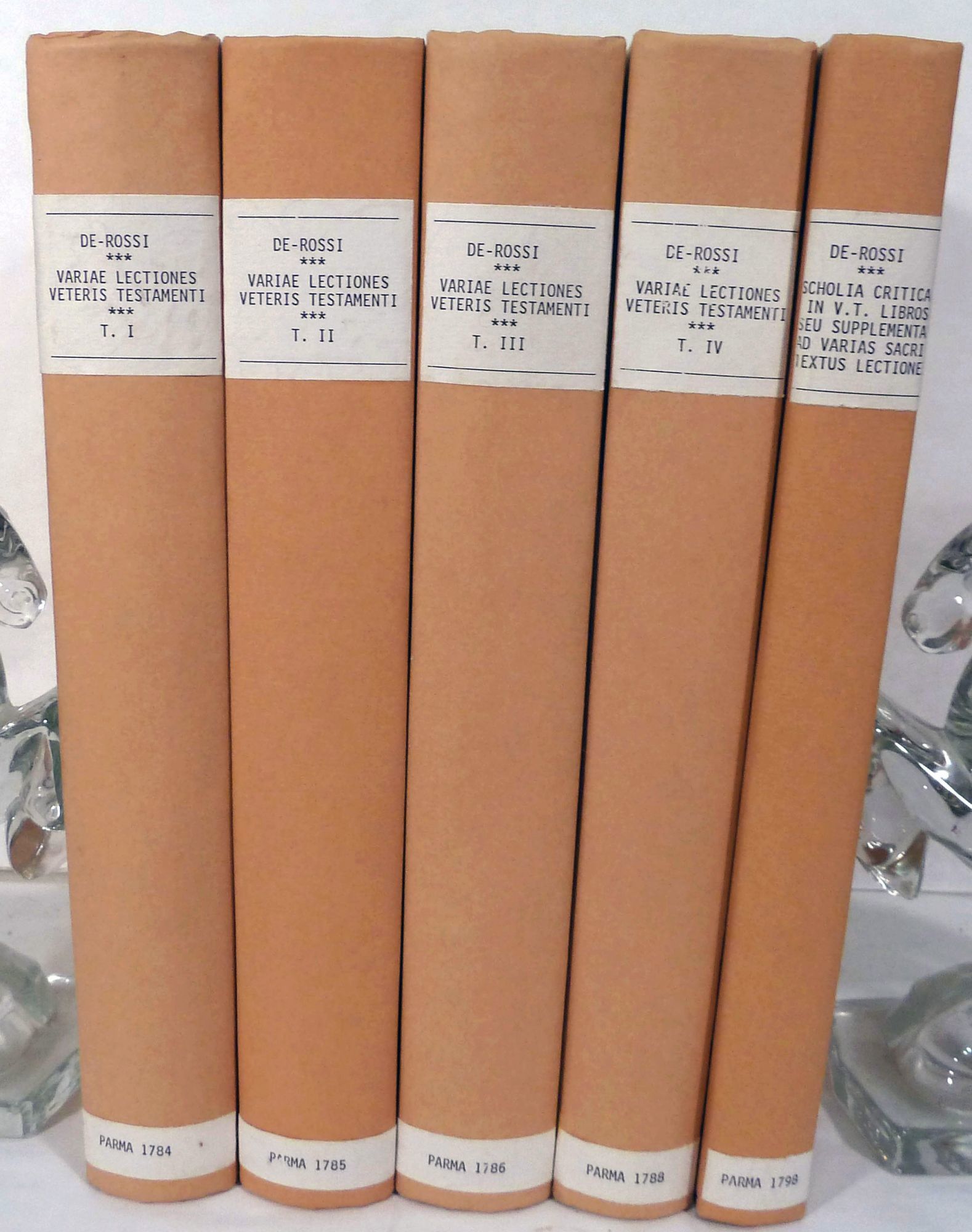 Parma: Ex Regio Typographeo, 1798. First edition. Boards. Modern, uniform light brown boards with paper spine labels. Fine. 5 vols. 29 x 21 cm. Bodoni Press production; bibliographic and critical commentaries concerning the Old Testament, textual studies from sources hitherto unknown. De Rossi devoted himself to three chief lines of investigation—-typographical, bibliographical, and text-critical -- on the collection of the variant readings of the Old Testament, To determine their bibliographical position he undertook a critical study of the annals of Hebrew typography. Exceedingly clean and bright set, exquisitely printed with a hint of occasional minor age-toning. BROOKS BODONI, 279 & 731. BRUNET Vol. IV, 1406-1407. OCLC: 71451148.