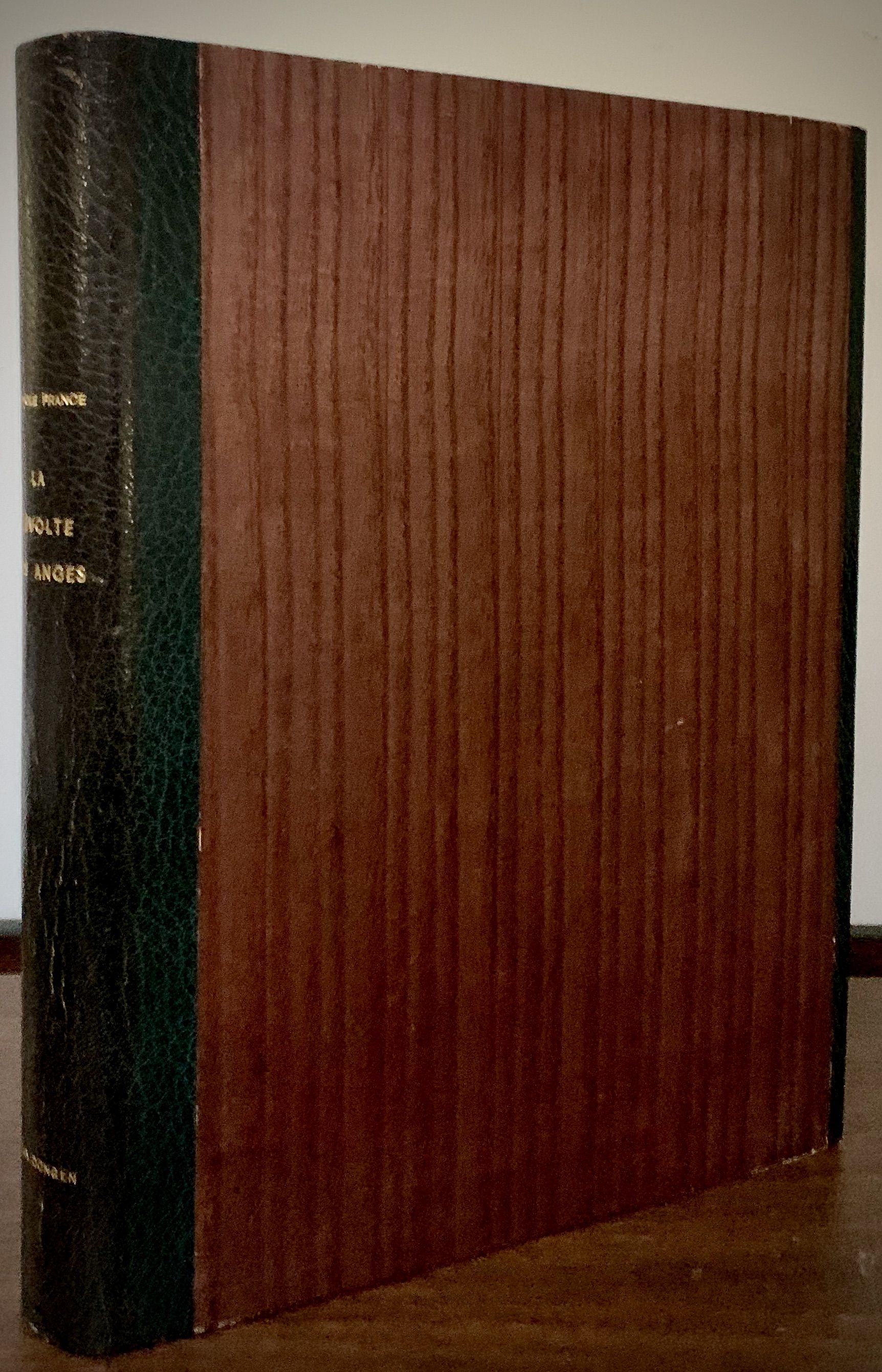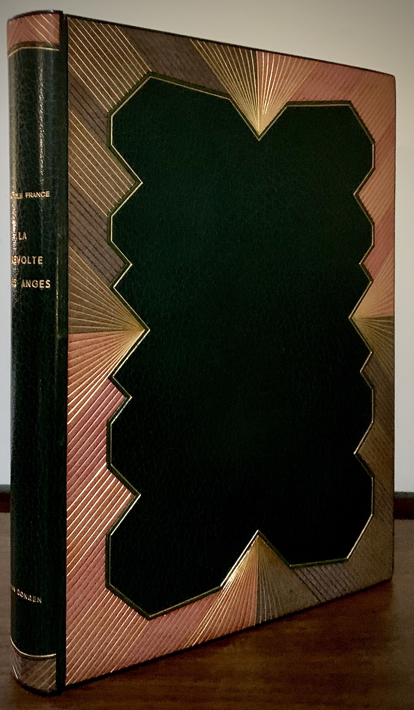 Paris: Scripta Et Picta, 1951. leather_bound. Full green morocco, covers and spine inlaid with light green, tan and gray morocco, ruled in colors and gilt, all edges gilt, green suede doublures, uniform morocco edged chemise. Fine in slightly nicked slipcase. 221 pages. Folio, 47 x 29 cm. Fifty-eight colored lithographs by Kees Van Dongen. Text printed in red and black with red and green initials; lithographs editioned by Mourlot. Limited edition copy 210 of 210. Van Dongen, a Dutch painter joined the fauvist movement in 1906, became a fashionable portraitist after World War I, but even in that medium he gave up all constraint -- he left a pitiless interpretation of Anatole France (our author here) as well as others, condemning a period and a class. Designer morocco binding by Madeleine Gras. Some foxing throughout, binding particularly bright and sharp, slight edge rubbing to chemise.
