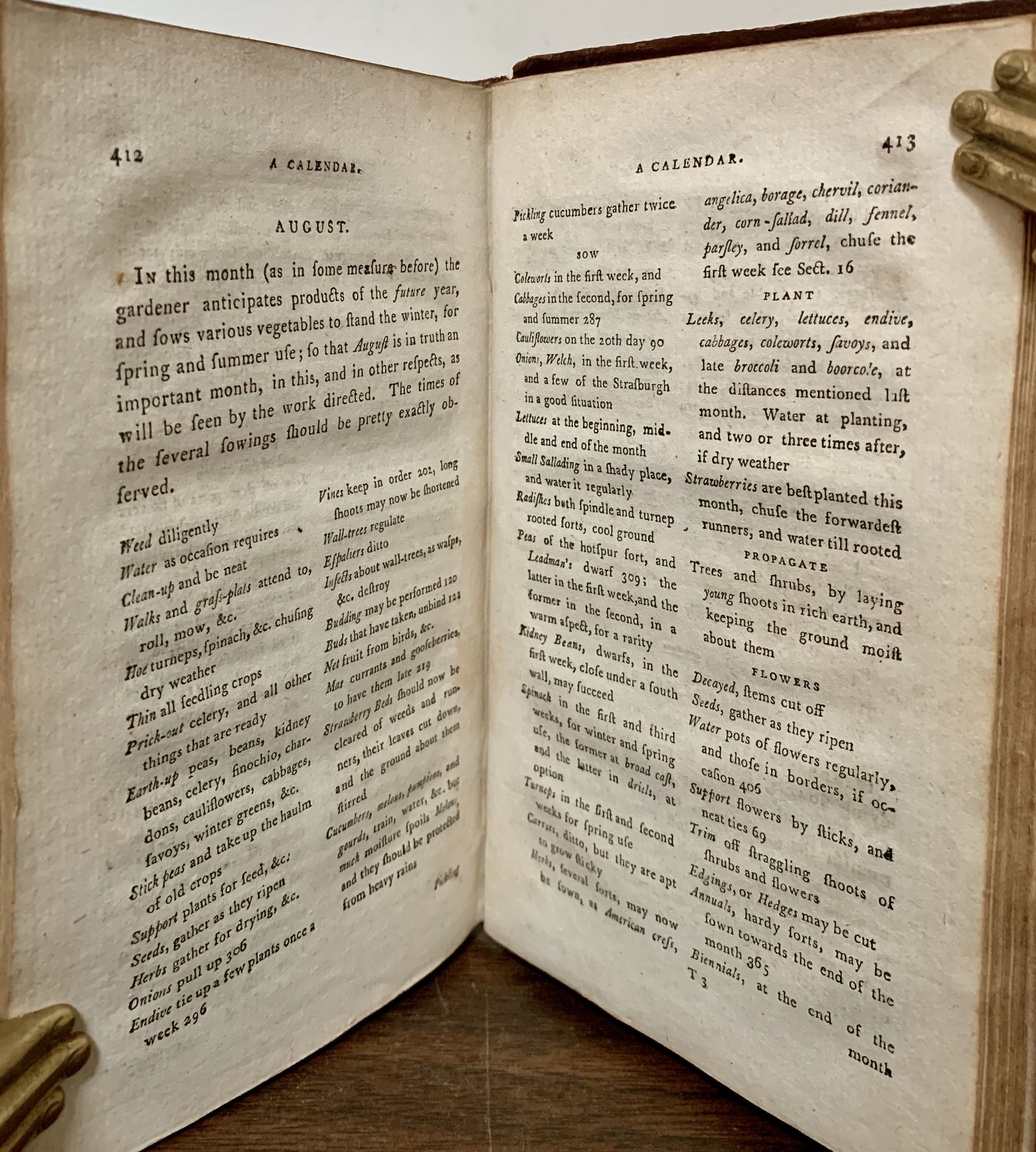 London: For the author by John Rider, 1796. First edition. leather_bound. Contemporary full sheep. Very good. 443, 10 (Index). 17 1/2 x 11 cm. List of Subscribers. HENREY Vol.II, p.468. "This instructive little book, written professedly for the your gardener, remained popular over a long period.....the author was the Vicar of Brixworth, a small village in Northamptonshire." Inked owner inscription title page head, "Dame Susannah Harland 1797." Contains a detailed monthly calendar for planting. Modest, scattered text age-toning, corner wear, backstrip extremities chipped with slight loss.