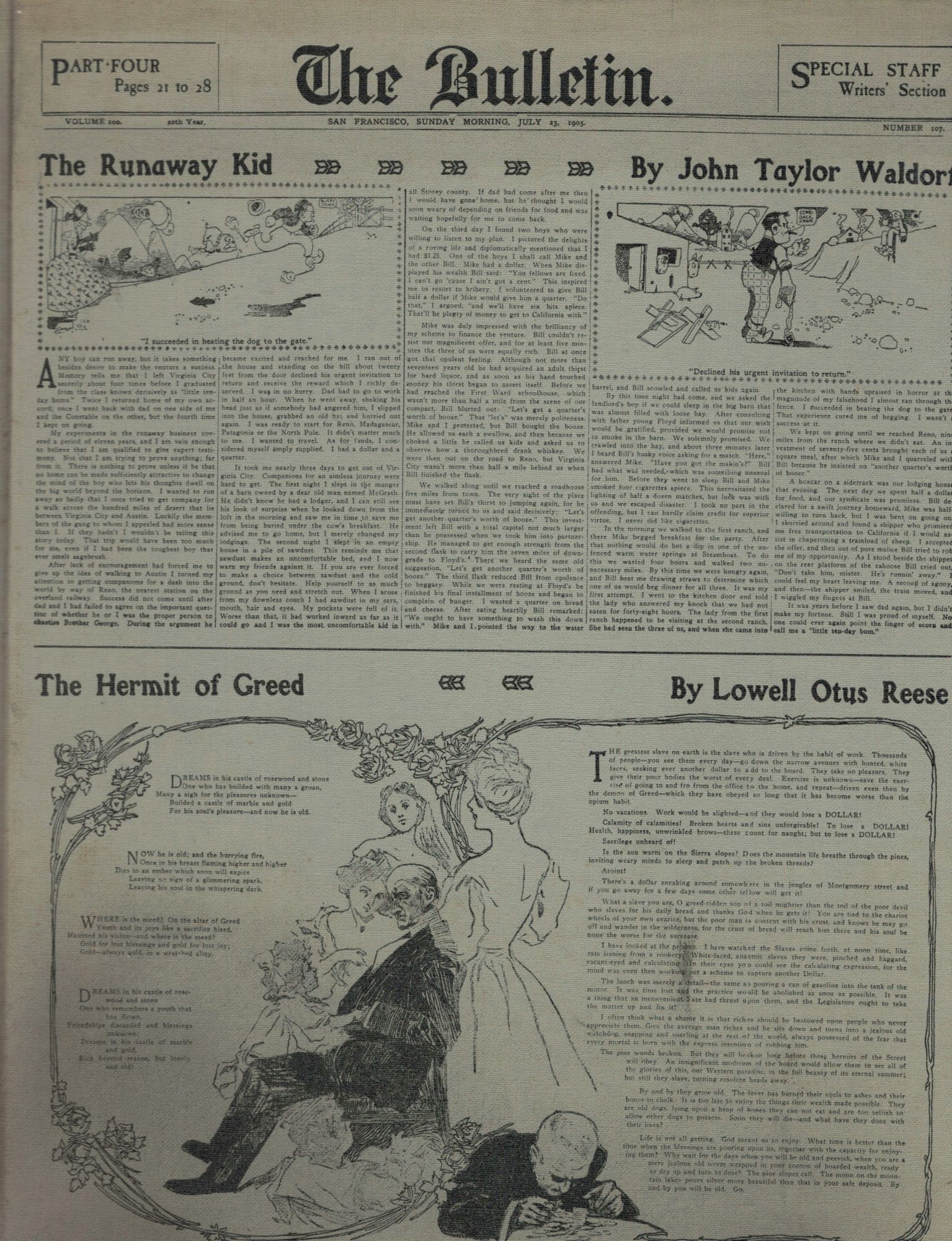 Berkeley: Friends of the Bancroft Library, 1968. First edition. Hardcover. Partly unopened. Orig. illustrated grey cloth. Near fine. 92 pages. Profusely illustrated with the original cartoons by Herb Roth from "The Bulletins". Features biographical and background material by Dolores Waldorf Bryant. This integrative volume reprints Waldorf's original stories from the San Francisco Bulletin of the early1900's. Waldorf's works are supplemented with a wealth of background information culled from other historical records and newspapers of the time. Number 16in the series of Keepsakes issued by the Bancroft Library.