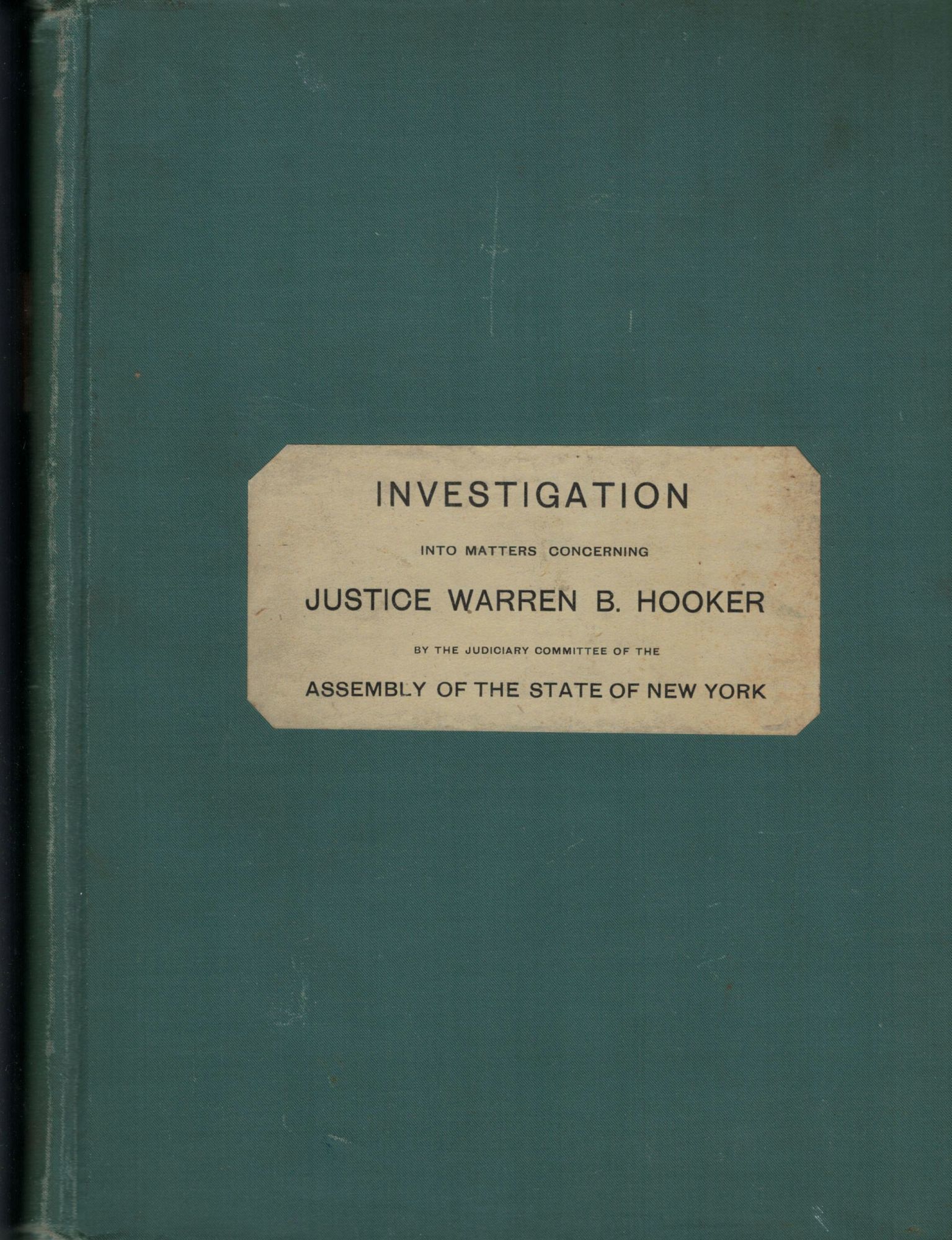 Albany: Brandow Printing Company, 1905. First edition. Hardcover. Orig. green cloth. 2 vols. Very good. 1480 pages. 8vo, Fraud proceedings and conviction of Justice Warren B. Hooker. Paper spine labels on front covers and spines.
