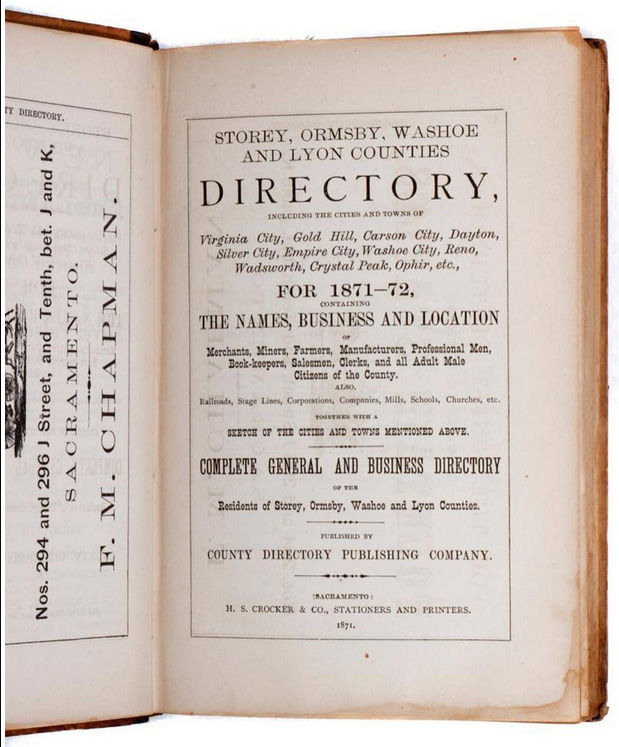 STOREY, ORMSBY, WASHOE AND LYON COUNTIES DIRECTORY, Including the Cities and Towns of Virginia City, Gold Hill, Carson City, Dayton, Silver City, Empire City, Washoe City, Reno, Wadsworth, Crystal Peak, Ophir, etc., for 1871-72, Containing the Names, Business and Location of Merchants, Miners, Farmers, Manufacturers, Professional Men, Book-keepers, Salesmen, Clerks, and all Adult Male Citizens of the County...