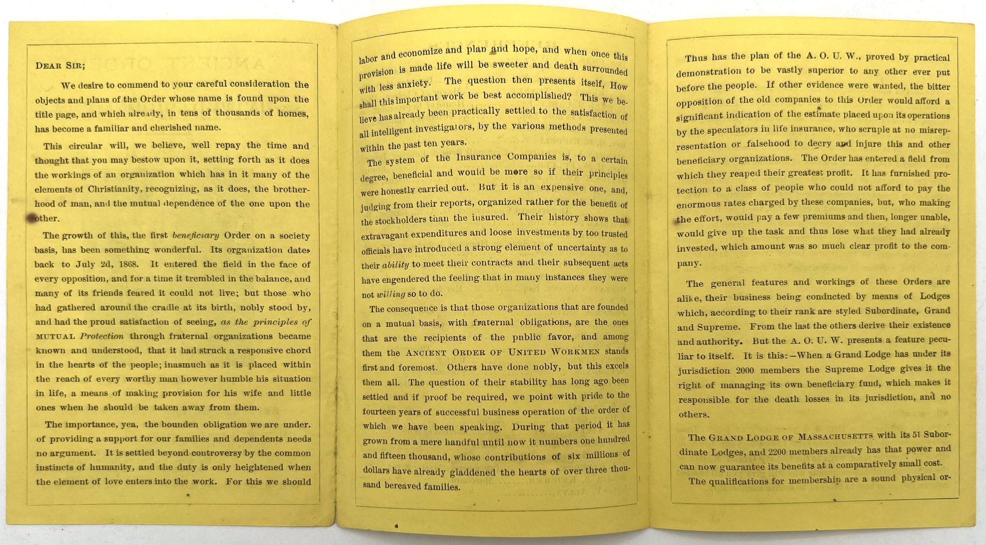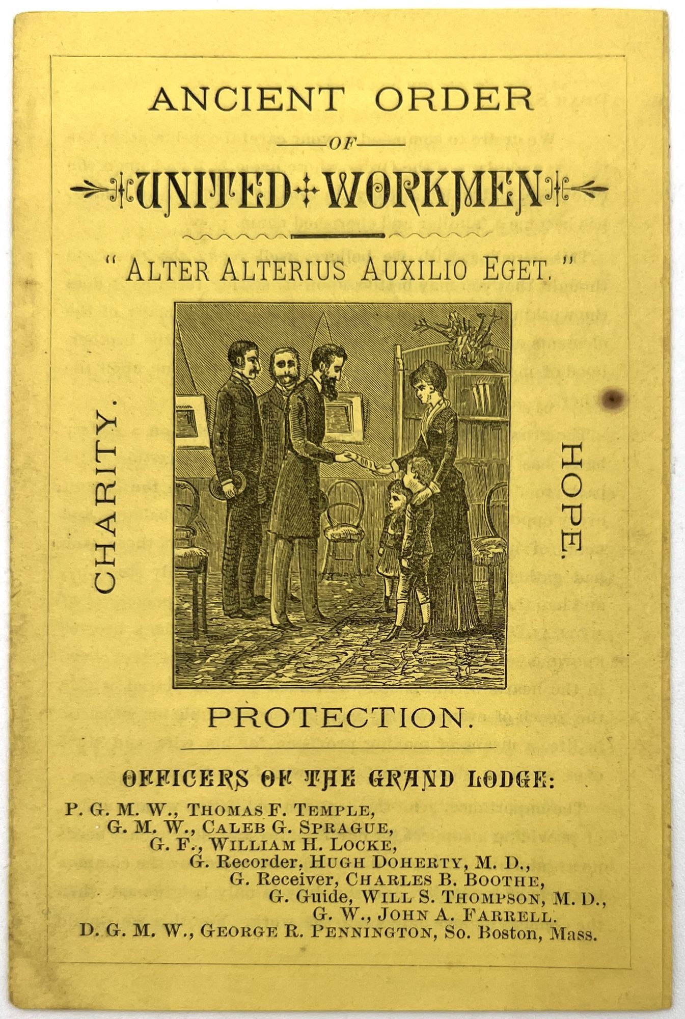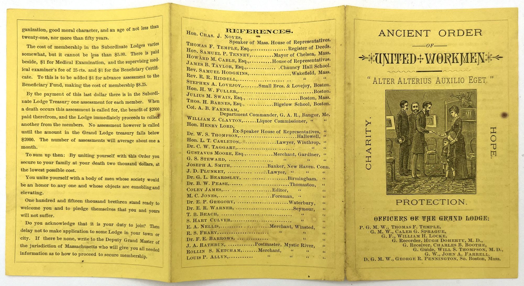 United States: Ancient Order of United Workmen, 1880. Very good. A little dust soiling/wear, one short tear to foot of first fold with no loss of text.. Printer circular promoting membership in the Ancient Order of United Workmen, a North American fraternal organization devoted to providing social support for families founded in 1868 following the Civil War. The group's main innovation was providing insurance for working men, allowing bereaved families to receive financial support after their deaths. Only White Christian men were allowed to join initially, but it gained a female auxiliary organization in 1873. The present circular provides a detailed overview of the group's mission and services, with a long list of references and their occupations on the back. Includes an image of three men from the organization handing money to a bereaved widow and her children. Folding pamphlet printed on yellow paper measuring approx. 5" by 3.25" folded.