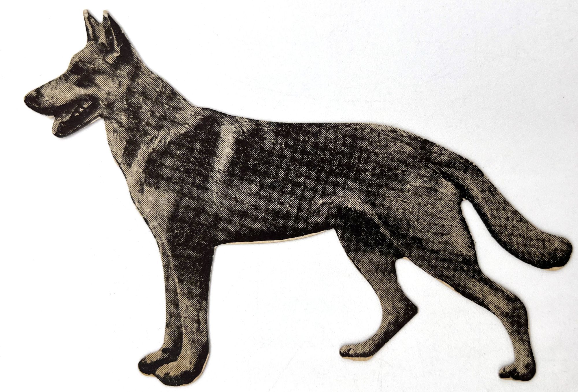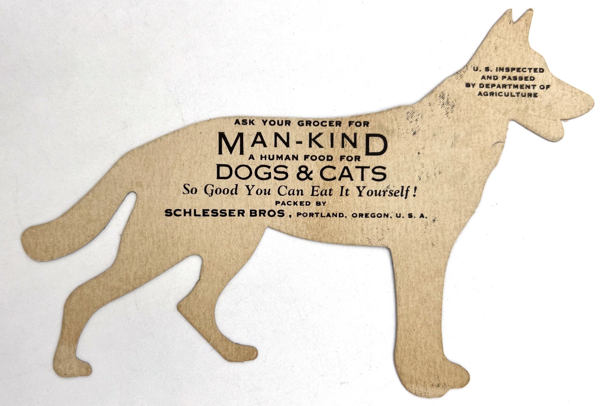 Portland, Oregon: Schlesser Bros, 1940. Very good. Light toning, dust soiling.. A 1940's printed advertising die-card for "Man-Kind" brand dog and cat food, a high quality pet food "So Good You Can Eat It Yourself!". Shaped like and depicting a German Shepherd, with the advertising text on the verso. Notice how much the breed standard has changed from the 1940s. Measures approx. 4" by 5.5