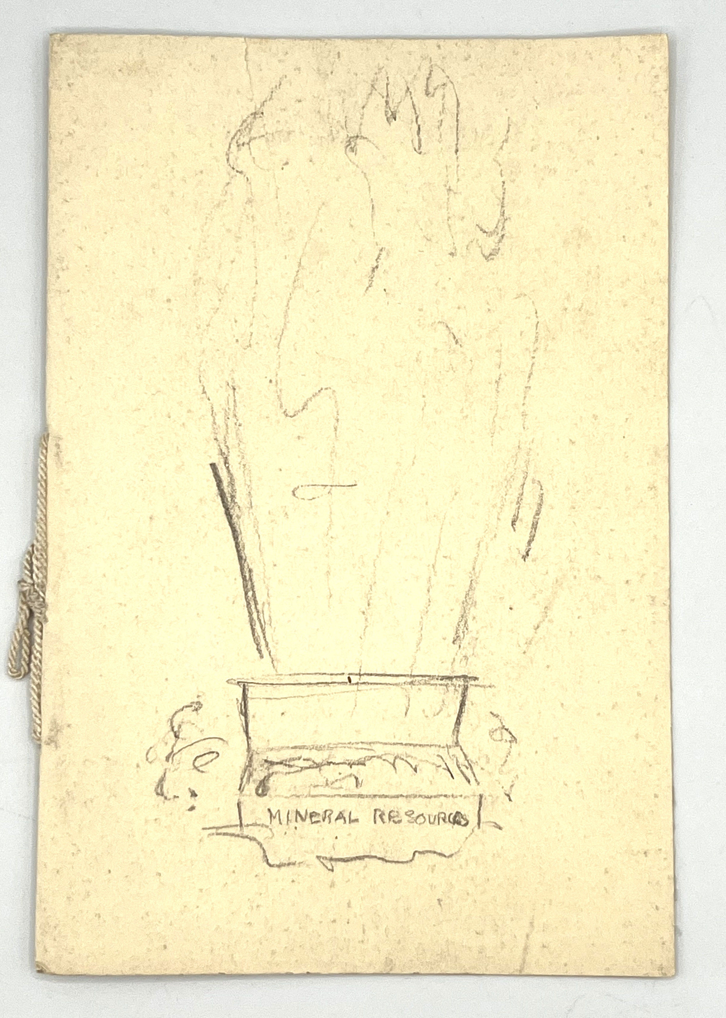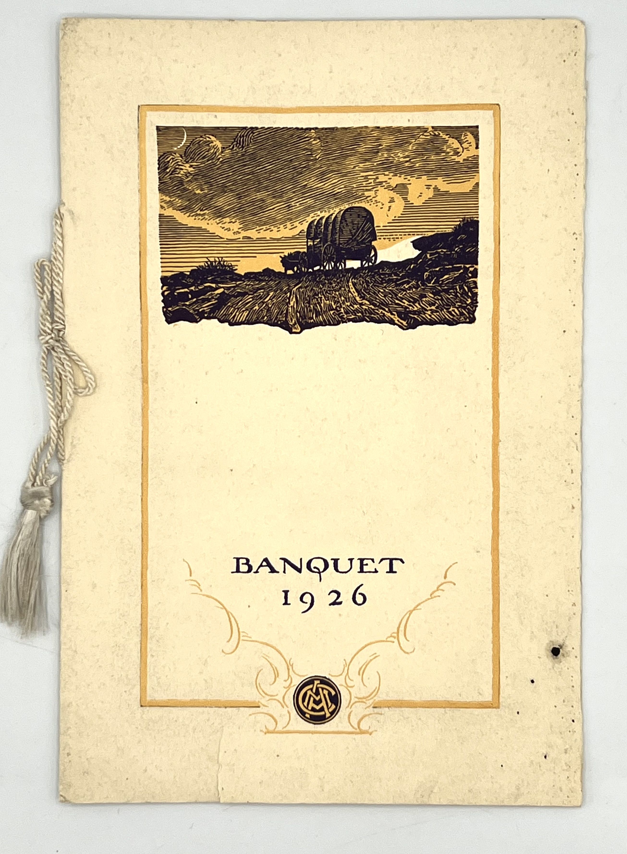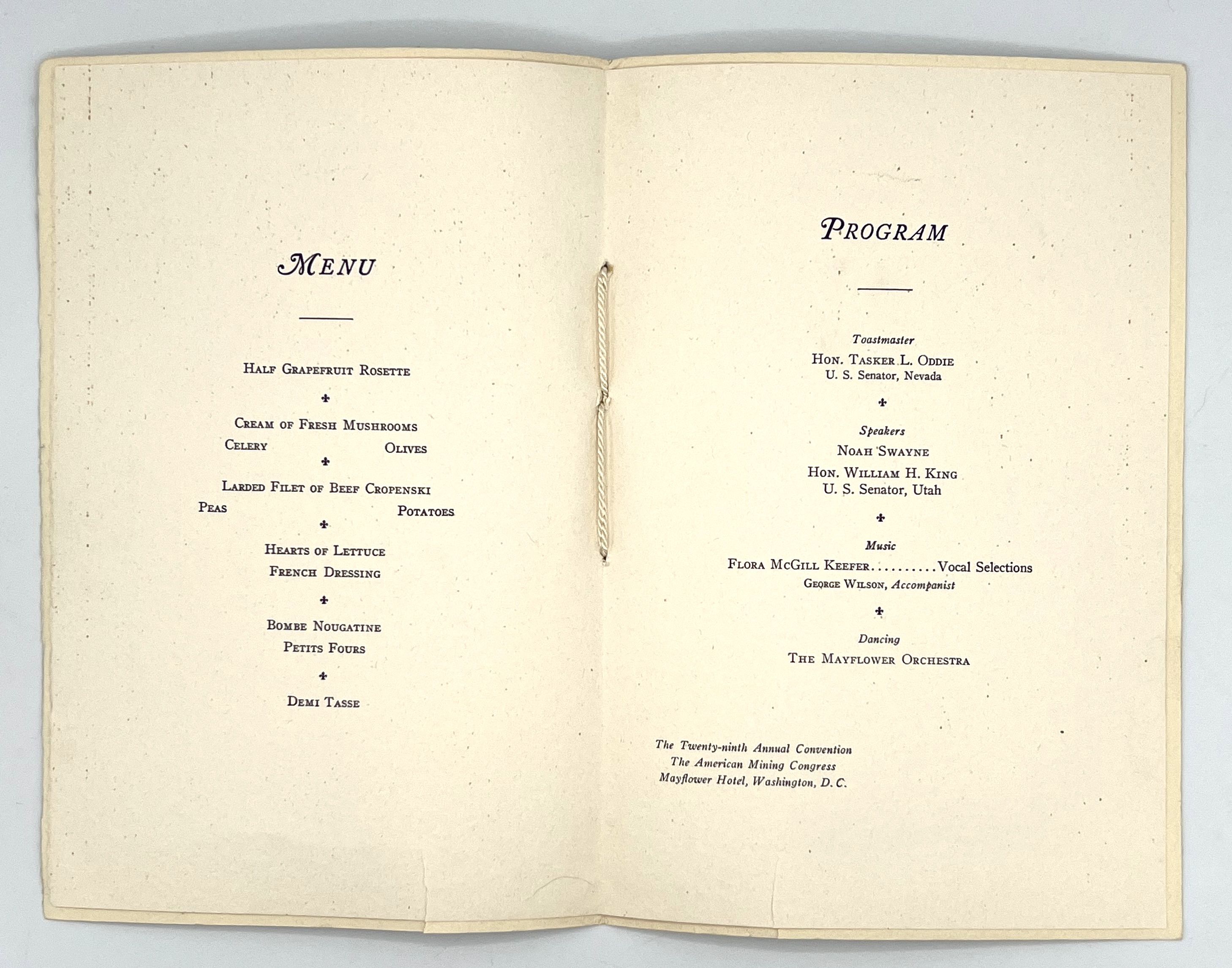 Washington DC, 1926. Cards. Cream illustrated, textured craft paper with white rope ties. Very good. 25 x 16 cm. Elegantly illustrated Banquet Menu and Program held at the Mayflower Hotel in Washington D.C. The toastmaster: Hon. Tasker L. Oddie, U.S. Senator, Nevada. The speakers: Noah Swayne & Hon. William H. King, U.S. Senator, Utah. An interesting pencil illustration on ther rear cover displaying a box filled with "Mineral Resources". 1 cm. closed tear to lower wraps and paper, and small ink spot on cover, otherwise clean and crisp.