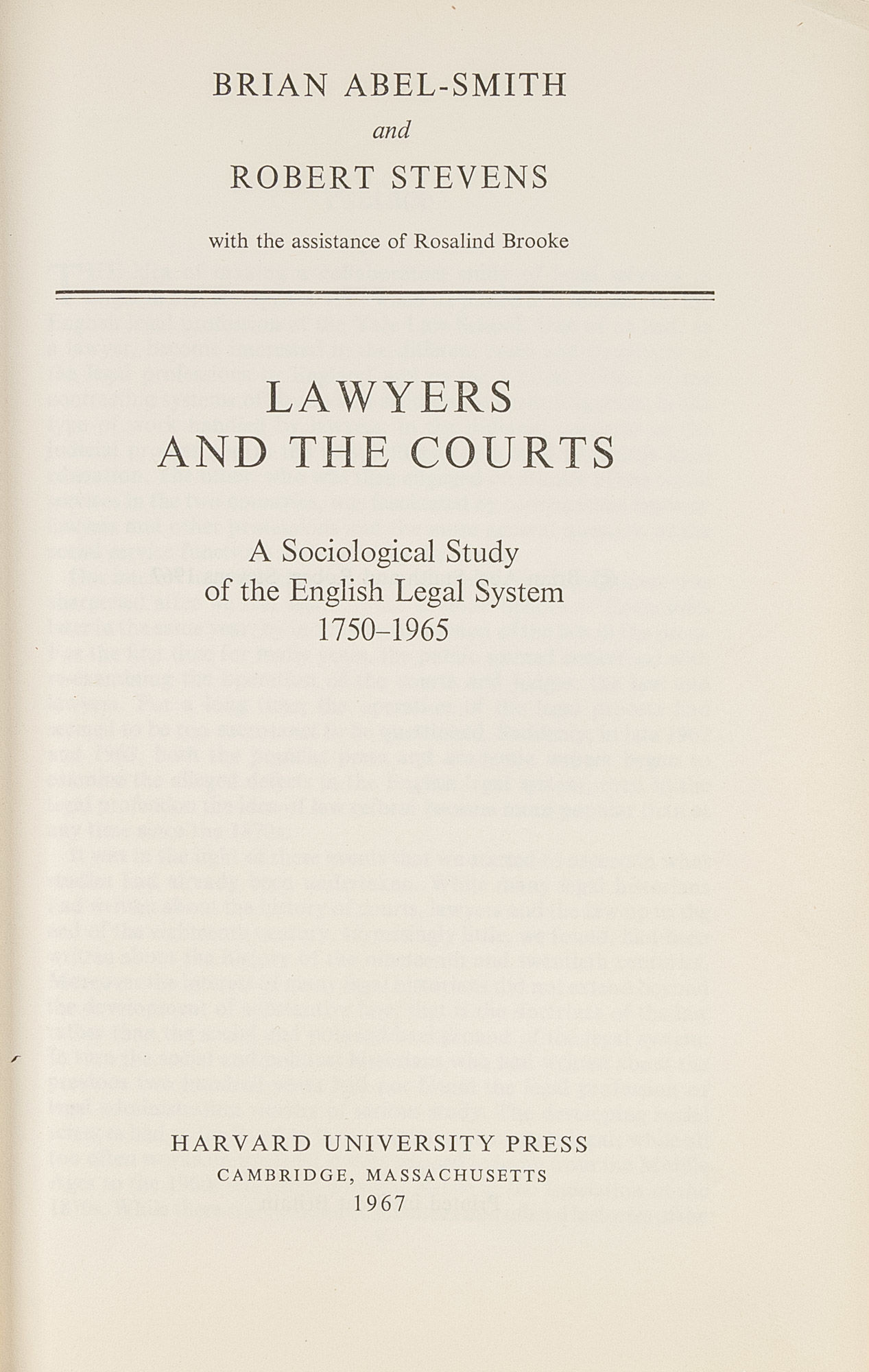 1967. Abel-Smith, Brian, and Robert Stevens. Lawyers and the Courts: A Sociological Study of the English Legal System 1750-1965. Cambridge, Mass.: Harvard University Press, 1967. xiv, 504 pp. Cloth hardcover very good, in lightly worn dust jacket. $45.