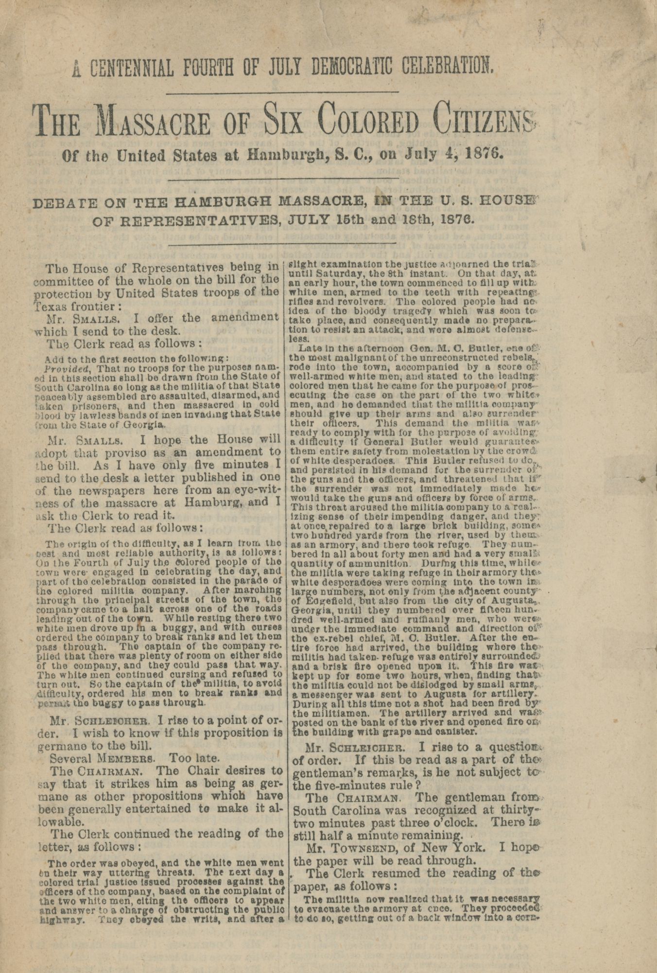 Washington, 1876. 8vo, 16 pp. Some tape repairs to margins else fine, very good condition overall. Very Good. The transcript of the debates in Congress following the Hamburg Massacre, which as a seminal event in South Carolina’s history and in the use of violence as a form of voter suppression. The pamphlet here reproduces the debates in Congress in July 15th and 18th of 1876, debating whether or not to withdraw Federal troops from South Carolina and reassign them to Texas. Robert Smalls, the formerly enslaved Congressman from South Carolina’s Seventh District, was among those who spoke in favor of maintaining a troop presence in the state. The pamphlet was printed likely by the Republican National Committee to share the news of the massacre.