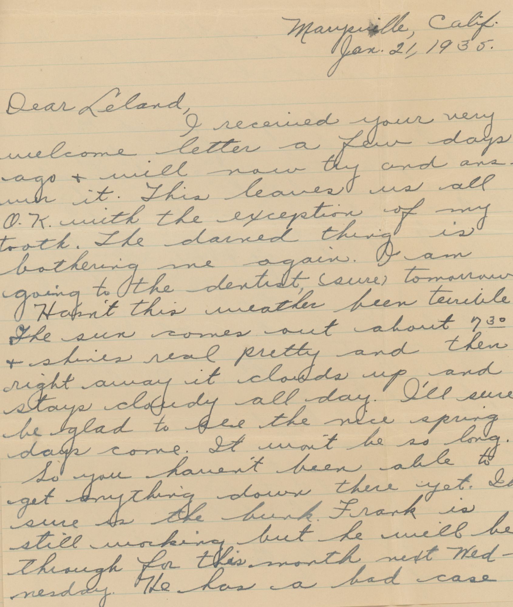 Leland is emasculated by the lack of work – and the humiliation keeps going, as in April of 1935 he is continually being told by superintendents and foremen that it will only be ‘a few more days’ before work will certainly start up again. Leland’s brother-in-law Frank is having a similar experience. Frank’s wife, Muriel, writes: