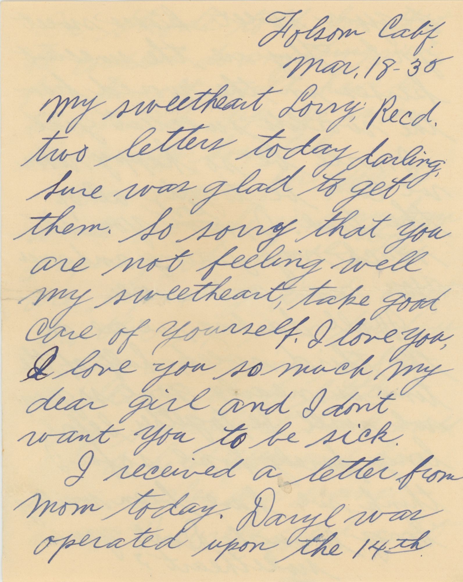 California, 1935. Approx. 226 letters with 10 empty envelopes: , Mainly Between Leland Victor Moffitt (1904–1994) and Lora Marie Rolison, née Hickman (1897–1984).appx 102 letters to Leland from Lora; 94 letters to Lora from Leland; 30 letters from friends and family. Lora Rolison and Leland Moffitt probably met at Lora’s family’s ranch in Cottonwood, Shasta County, where she lived with her husband Marion Rolison (1896–1949), their son Money Rolison (1922–????), and likely some other members of Lora’s family. It’s unclear exactly how or when the affair began, although Leland seems to have been sent away to Folsom, just outside of Sacramento, in October of 1934 – probably because the affair was discovered. Lora says of her husband Marion that: