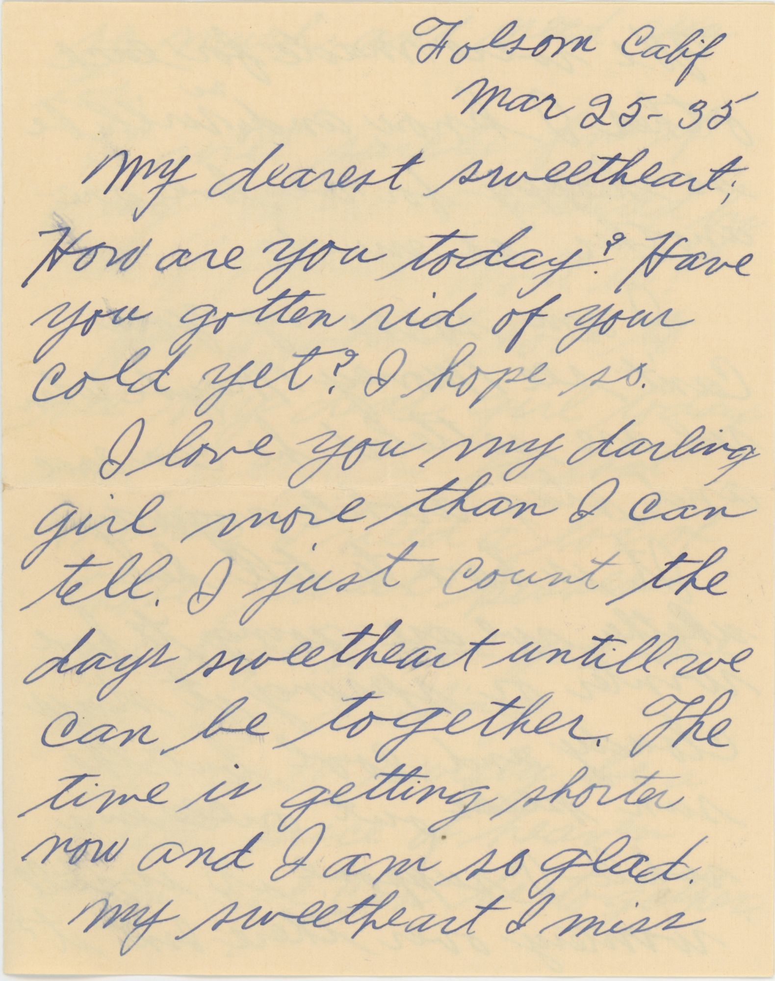 “Well, I guess this will be my last love letter for a while + I hope for always [...] Sweetheart, do you know that to-morrow then Saturday – Then when that choo choo train comes in Sunday – I sure hope I’ll see my sweetheart (April 11, 1935)