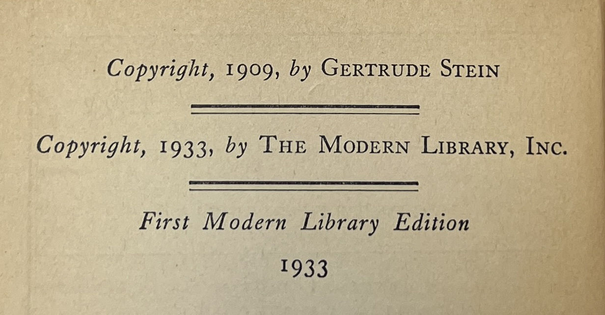 New York: Modern Library, 1933. First Edition. Hardcover. Good. Good, lacking the jacket. Red cloth, rubbed and with some frayed at the edges, gilt lettering and designs on the spine and front board. Square, binding shaken with the front hinge cracked, firmly bound otherwise. The first Modern Library edition of one of the first works of Modernist literature, originally published in 1909 shortly after Stein settled in Paris.