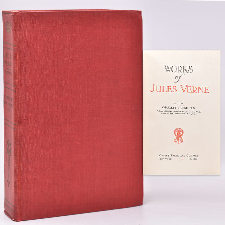 New York and London: Vincent Parke and Company, 1913. Illustrated with colored frontispieces in each volume and other illustrations in black and white. 15 vols. Royal 8vo. Publisher's red cloth, t.e.g., rest uncut. Fine, spine stamping slightly faded. Illustrated with colored frontispieces in each volume and other illustrations in black and white. 15 vols. Royal 8vo. The standard English translation of Verne, an attractive edition of the author's works containing most of the major titles.