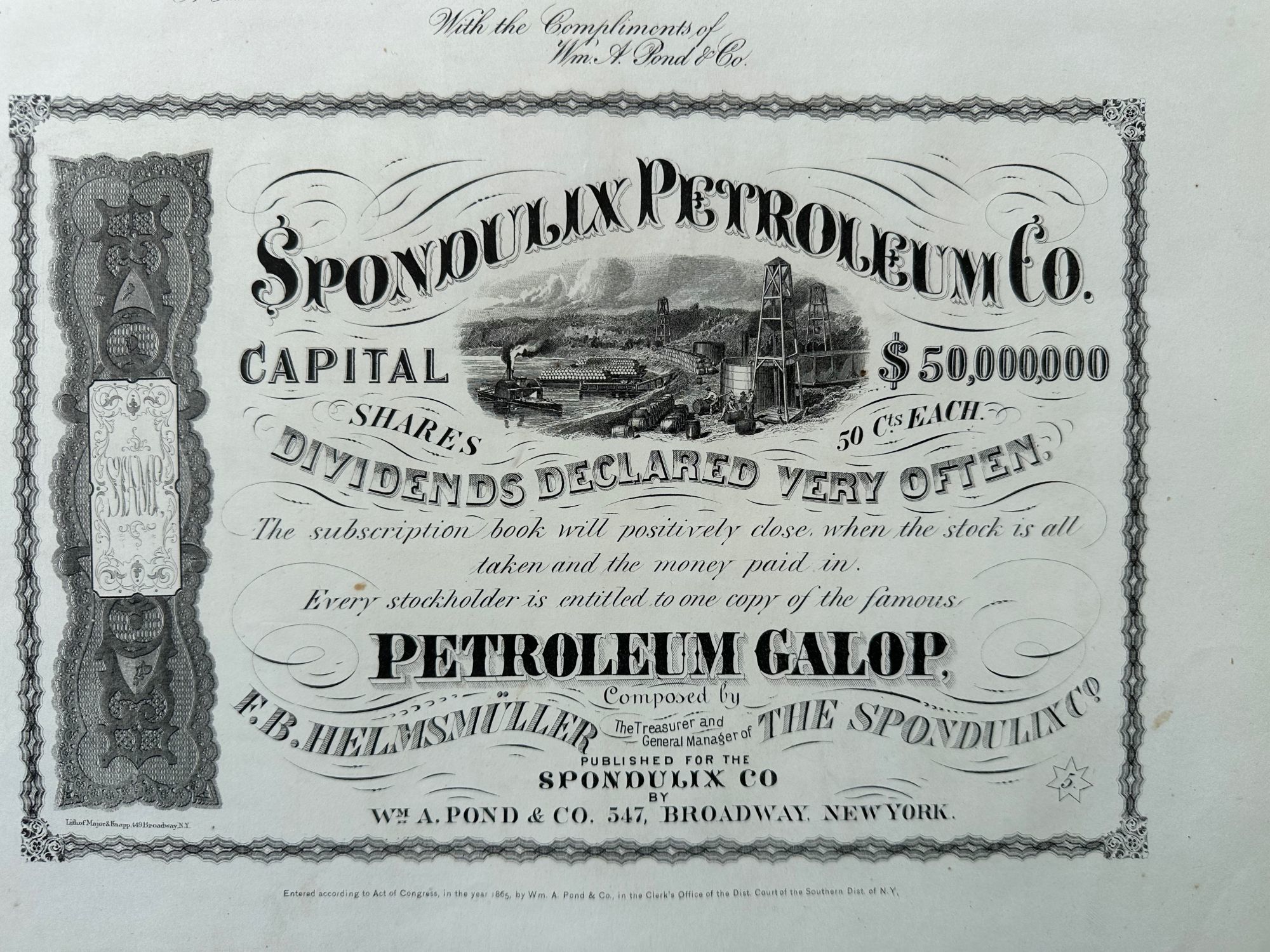Spondulix Petroleum Co. / Capital $50,000,000 / Shares 50 cts Each. / Dividends Declared Very Often… / Every Stockholder is Entitled to One Copy of the Famous Petroleum Galop
