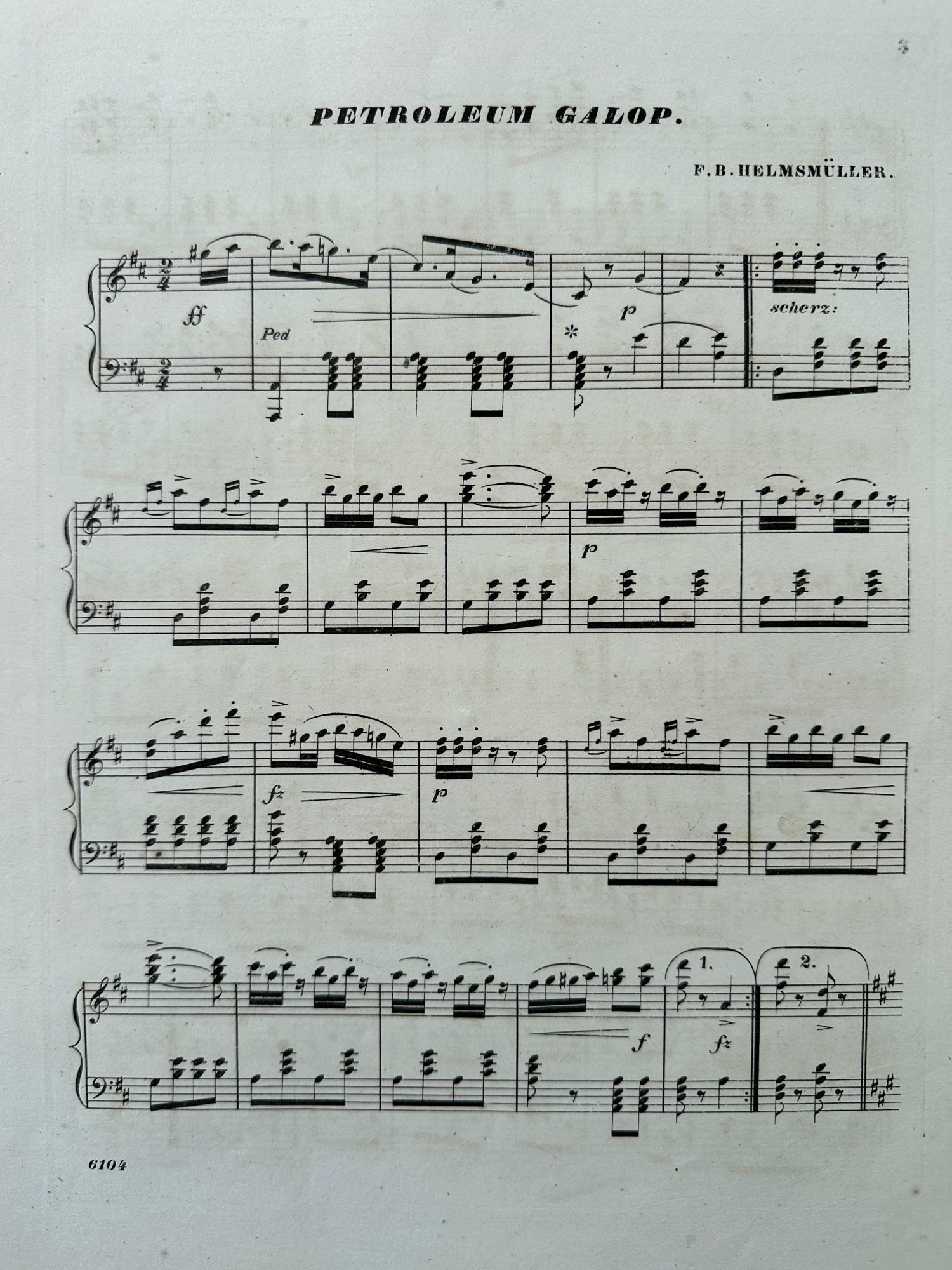 New York: Wm. A. Pond, 1865. Folio, 13 ½ x 10 ½ inches. Fine condition. Fine. An unusual use of sheet music as satire, with the lithographed cover showing a fake stock certificate. The cover - engraved by Major & Knapp - advertises an ownership share in the Spondolix Petroleum company and states that F.B. Helmsmuller, who was actually a noted composer, was the “Treasurer and General Manager” of the company. This is a particularly fine example of the piece. In our research we found several references to this piece as being a real stock certificate for a real company, however this is clearly a parody of the oil business. This was printed in 1865, when the Pennsylvania oil industry was booming, and the engraved illustration appears to show a countryside scene in Pennsylvania or somewhere similar. Four copies in OCLC.