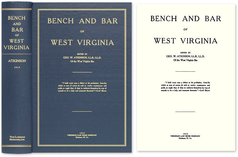 2008. ISBN-13: 9781584778981; ISBN-10: 1584778989. Vivid Sketches of Early West Virginia Lawyers Atkinson, George W. Bench and Bar of West Virginia. Originally published: Charleston, W. Va.: Virginia Law Book Co., 1919. xxvii, 543 pp. incl. portraits. Reprinted 2008 by The Lawbook Exchange, Ltd. ISBN-13: 9781584778981; ISBN-10: 1584778989.Hardcover. New. $95. * Reprint of the sole edition. Bar histories are a valuable compendia of information that is often impossible to find in any other source. Atkinson says his goal was to "sum up the legal lifework of the best known and most prominent members of the Bar of West Virginia" without "flattery, adulation and comparison of one with another, or of any one against the rest" (v). He fulfilled this aim admirably. The professional and personal lives of his subjects are described with great skill. Atkinson had the advantage of working at a time when many of the West Virginia Bar's founding members were still alive. Personal acquaintance with many of these lawyers, and of anecdotes about other lawyers through those he knew, enlivens the vivid sketches of the lawyers who practiced in West Virginia since its founding in 1863.